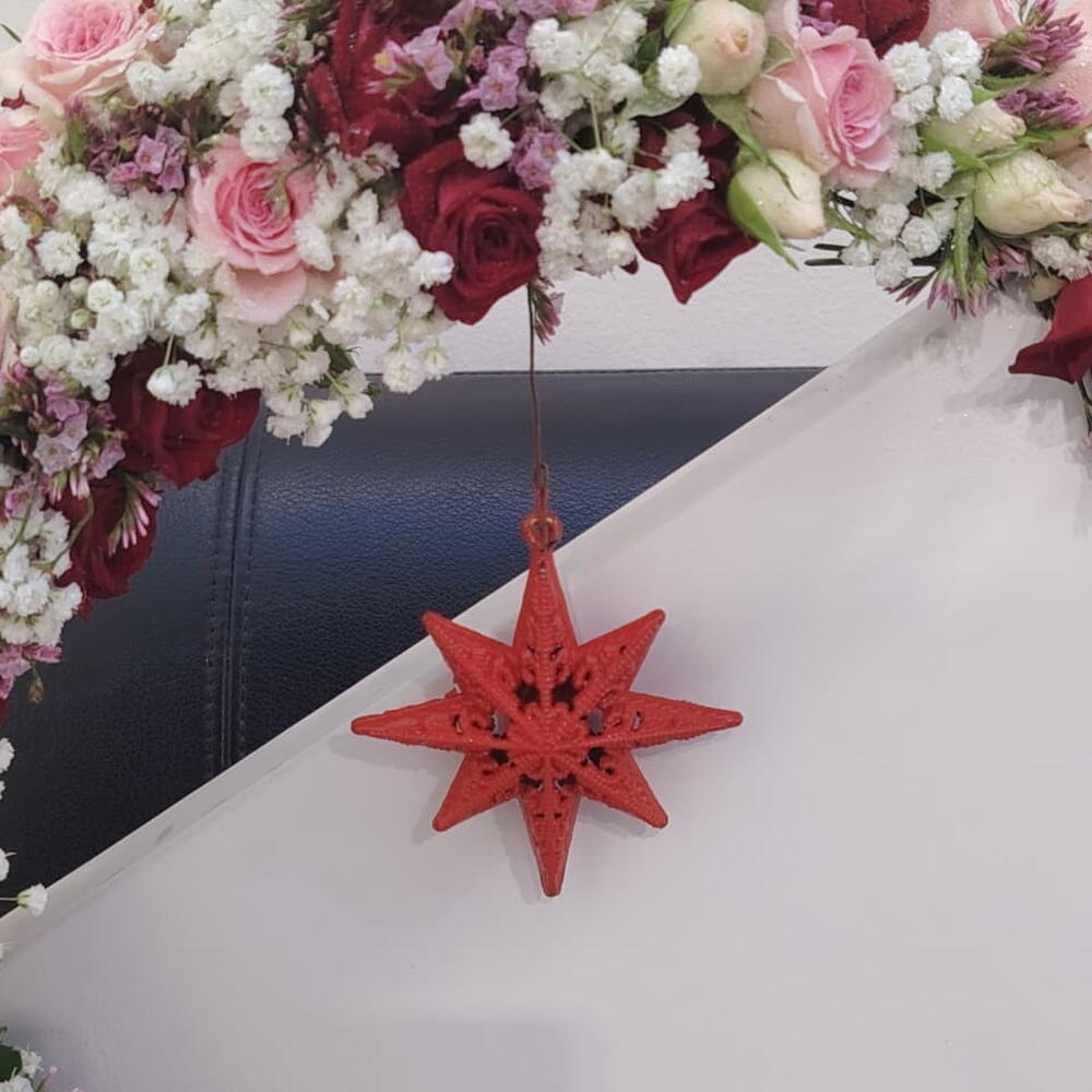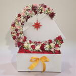 Фантазийная и художественная праздничная композиция, в которой большой, усыпанный цветами полумесяц нависает над безупречно белой подарочной коробкой. Полумесяц плотно заполнен изящным полотном из нежно-розовых, кремово-белых и тёмно-красных мини-роз, смягчённым облаками белой гипсофилы. С кончика грациозно свисает одна яркая красная звезда, а золотисто-жёлтая лента добавляет праздничный завершающий штрих этому символичному и душевному центральному элементу.