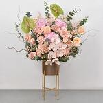 роза капучино - 10 шт. светло-розовая гортензия - 3 шт. silver brunia - 5 шт. эвкалипт пепельный - 5 шт. светло-розовая астильба - 6 шт. зелёный антуриум - 2 шт. персиковая крупная кустовая роза - 5 шт. двухцветоносный фаленопсис - 1 шт. премиальная золотая подставка - 1 шт.