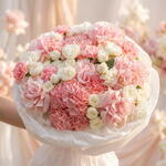 Роскошная текстурная композиция из нежно-розовых гортензий, роз и гвоздик для романтического эффекта розового облака. Идеальный грандиозный жест для тех, кто любит элегантные пастельные тона и пышные композиции. Отказ от ответственности Примечание: Фактические цвета и оттенки могут незначительно отличаться из‑за естественного освещения и настроек экрана.