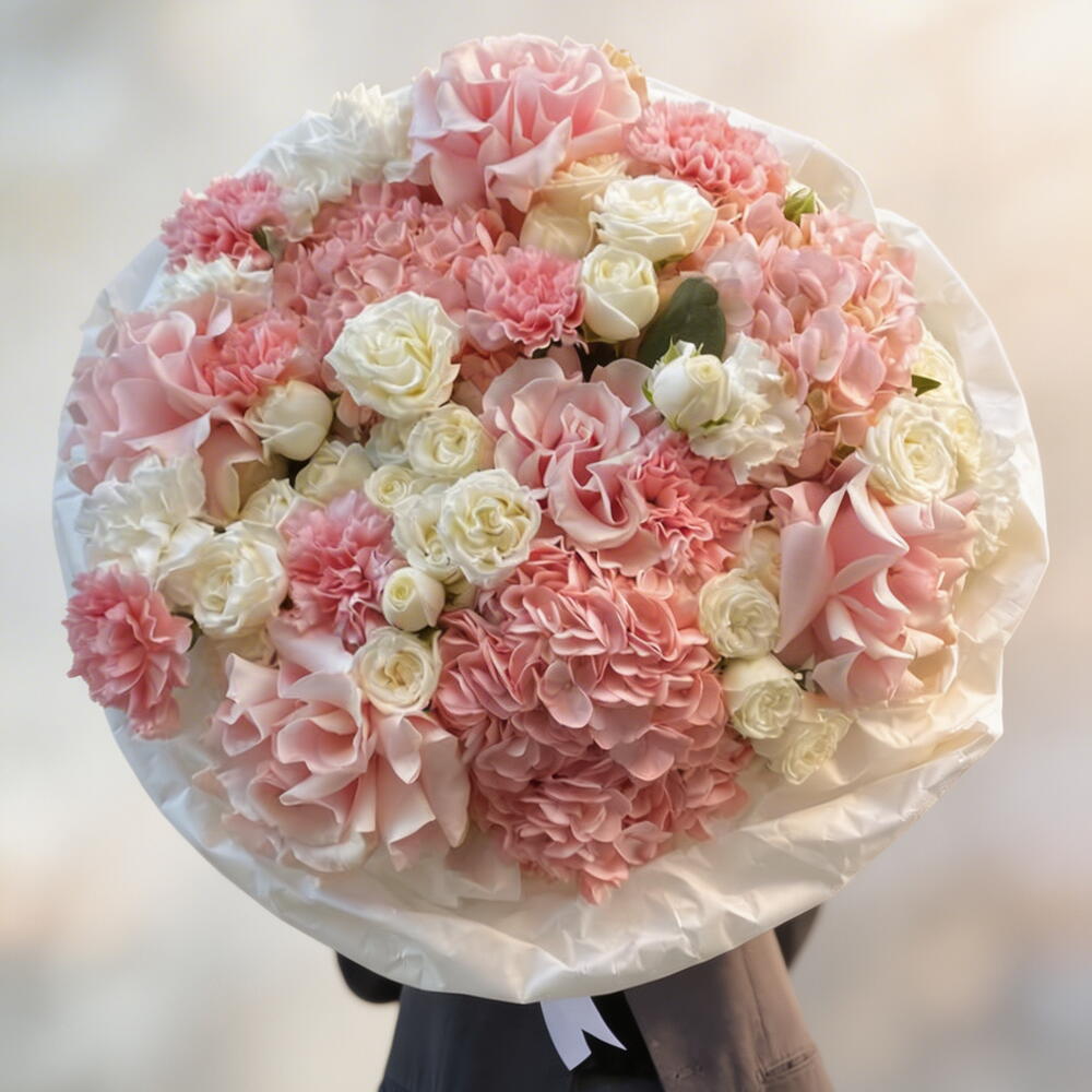 Роскошная текстурная композиция из нежно-розовых гортензий, роз и гвоздик для романтического эффекта розового облака. Идеальный грандиозный жест для тех, кто любит элегантные пастельные тона и пышные композиции. Отказ от ответственности Примечание: Фактические цвета и оттенки могут незначительно отличаться из‑за естественного освещения и настроек экрана.