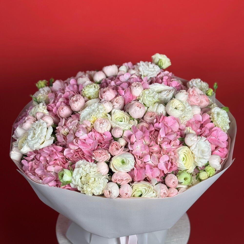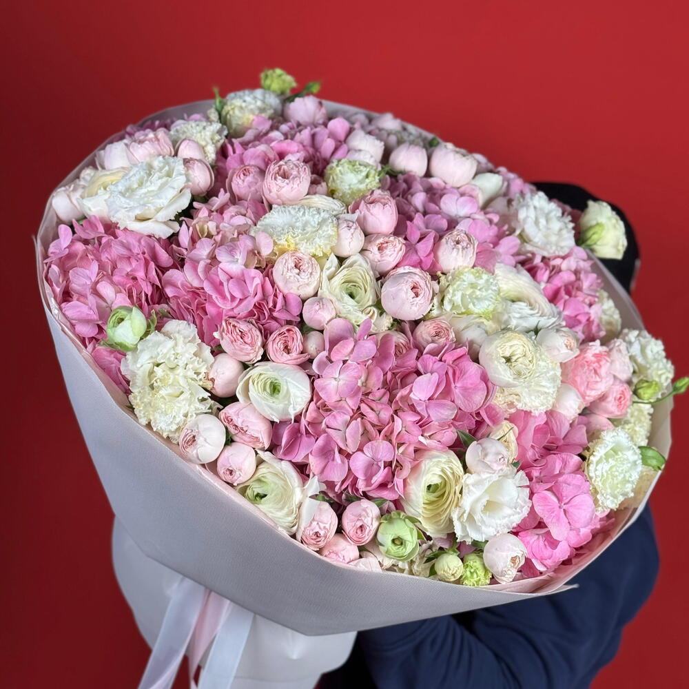 Букет «Клубничное стихотворение» — нежная и романтичная цветочная композиция, вдохновлённая мягкостью лета и сладостью садовой красоты. В составе — пышные гортензии, воздушные ранункулюсы, изящные садовые спрей-розы и грациозные эустомы; этот букет создаёт гармоничное сочетание фактур и оттенков, напоминающее нежный клубничный румянец.