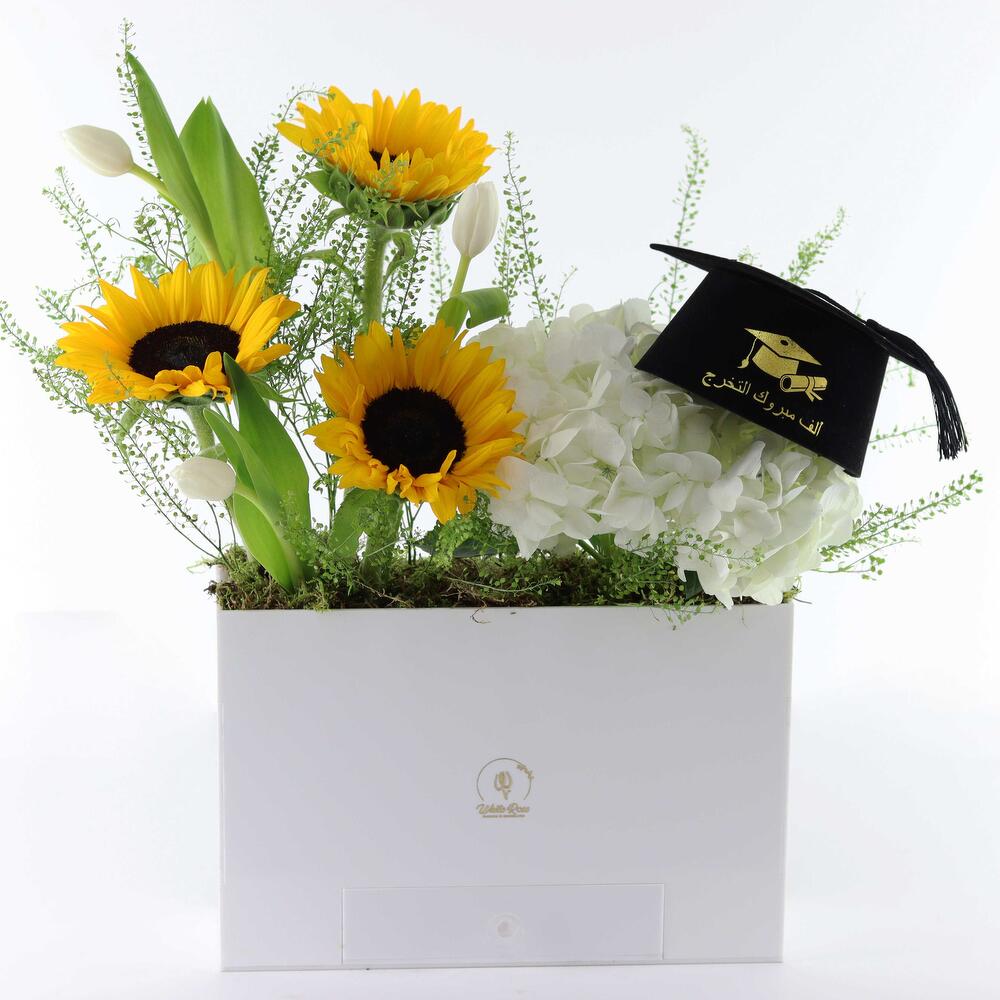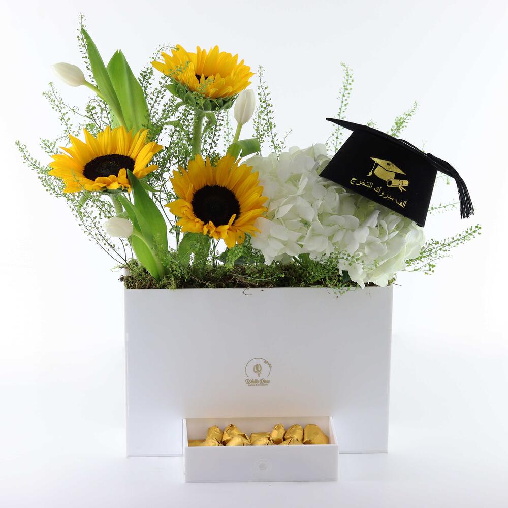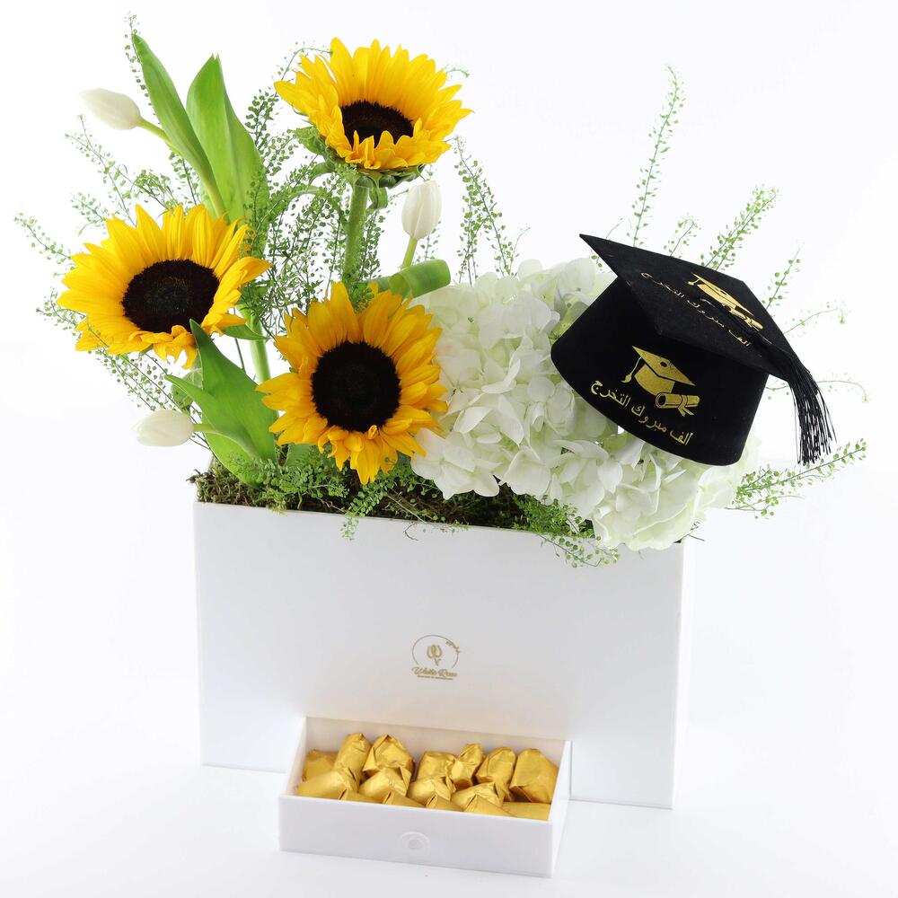 Hydrangea - 2 шт. Sunflower - 3 шт. Chocolate - 250 гр. Tulip - 2 шт. акриловая коробка - 1 шт. мини шапочка выпускника - 1 шт.