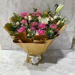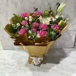 Ribbon - 2 шт. Eucalyptus - 6 шт. Solidago - 7 шт. lily white - 1 шт. wrapping paper - 10 шт. одна ветка рускуса - 2 шт. розовые розы - 9 шт. маленькая роза - 4 шт. эустома - 2 шт.