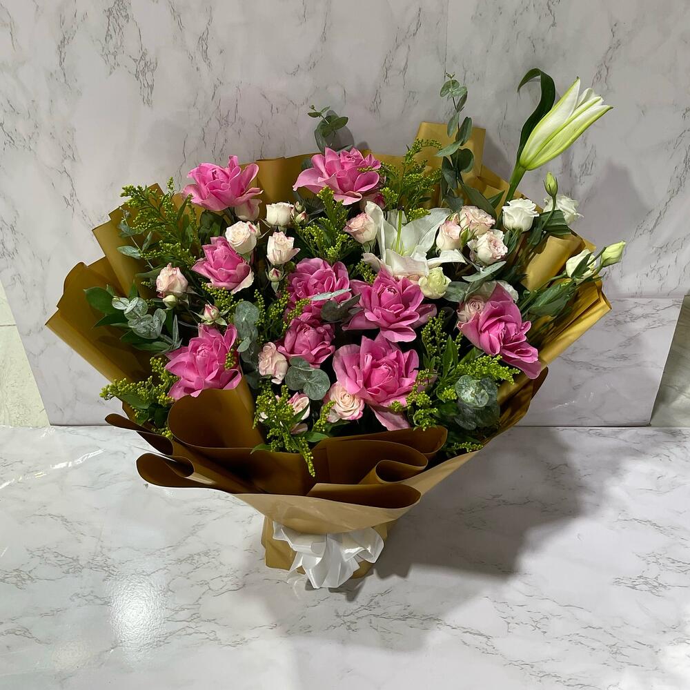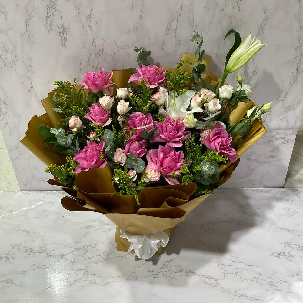Ribbon - 2 шт. Eucalyptus - 6 шт. Solidago - 7 шт. lily white - 1 шт. wrapping paper - 10 шт. одна ветка рускуса - 2 шт. розовые розы - 9 шт. маленькая роза - 4 шт. эустома - 2 шт.