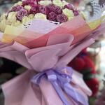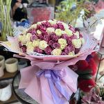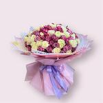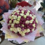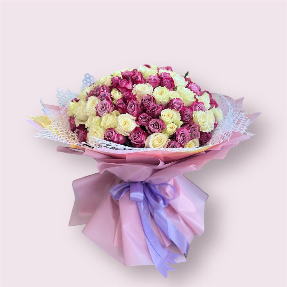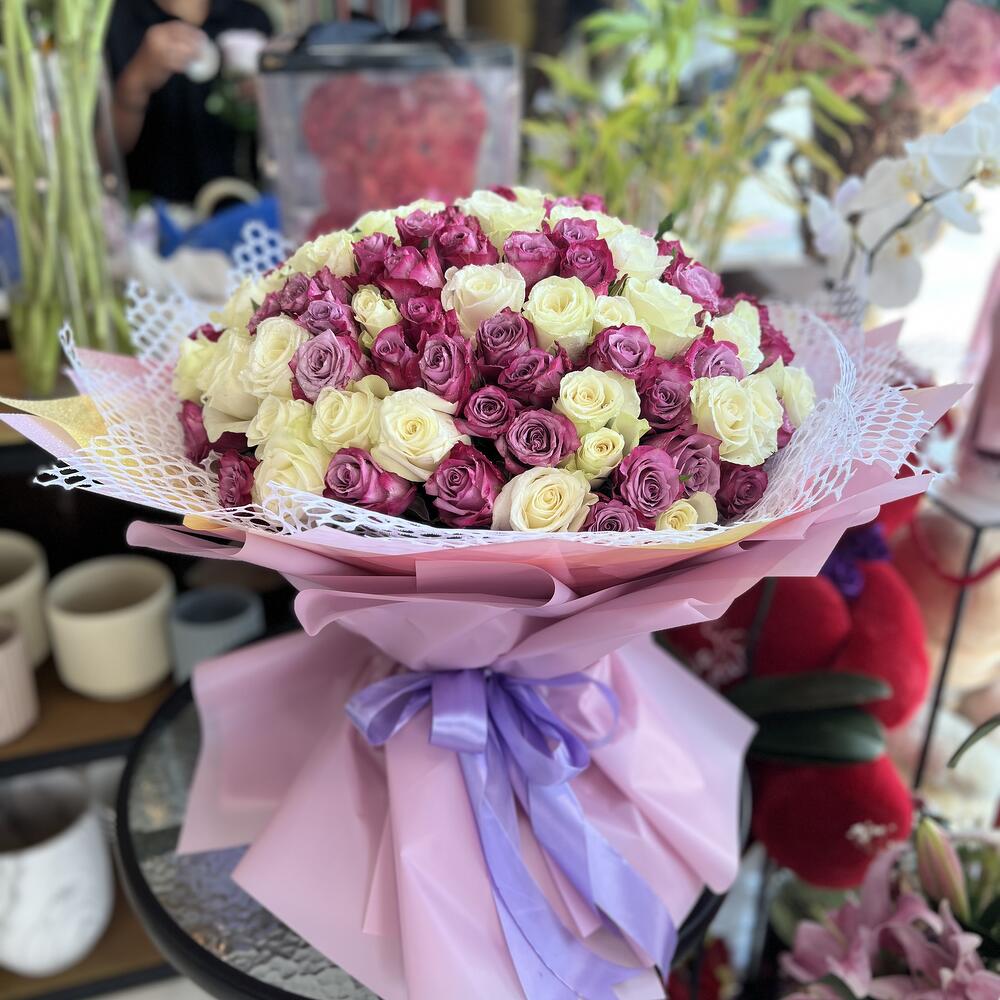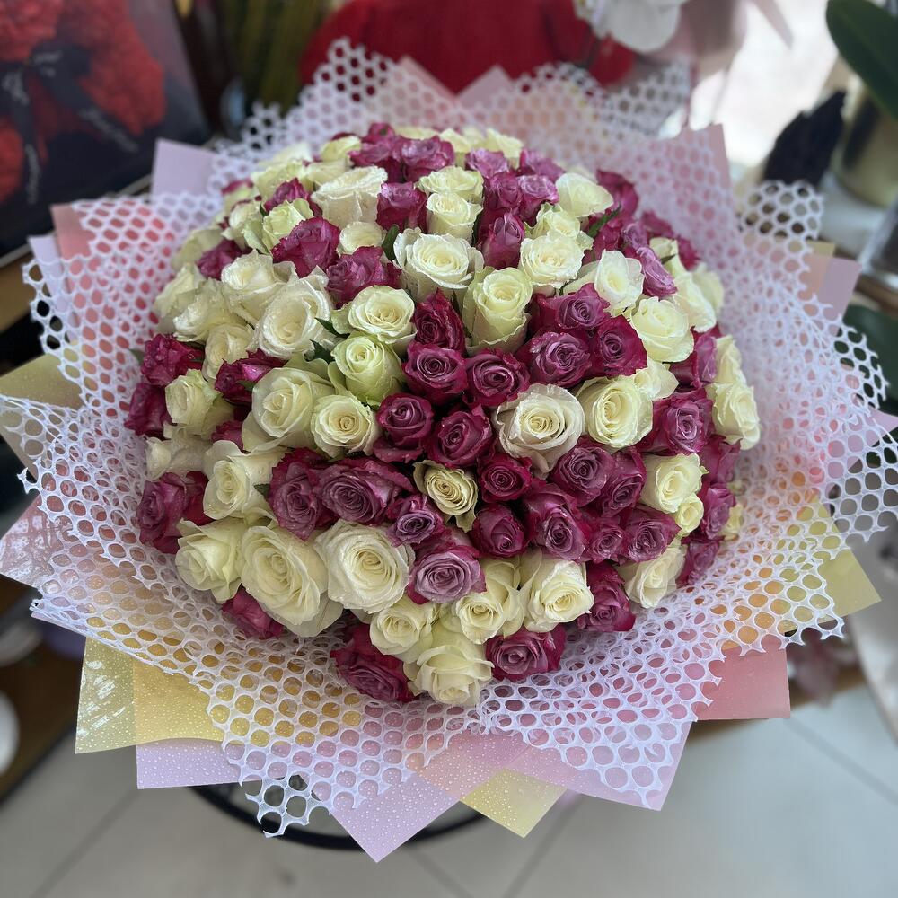 140 шт. микс белых и фиолетовых роз в красивой упаковке