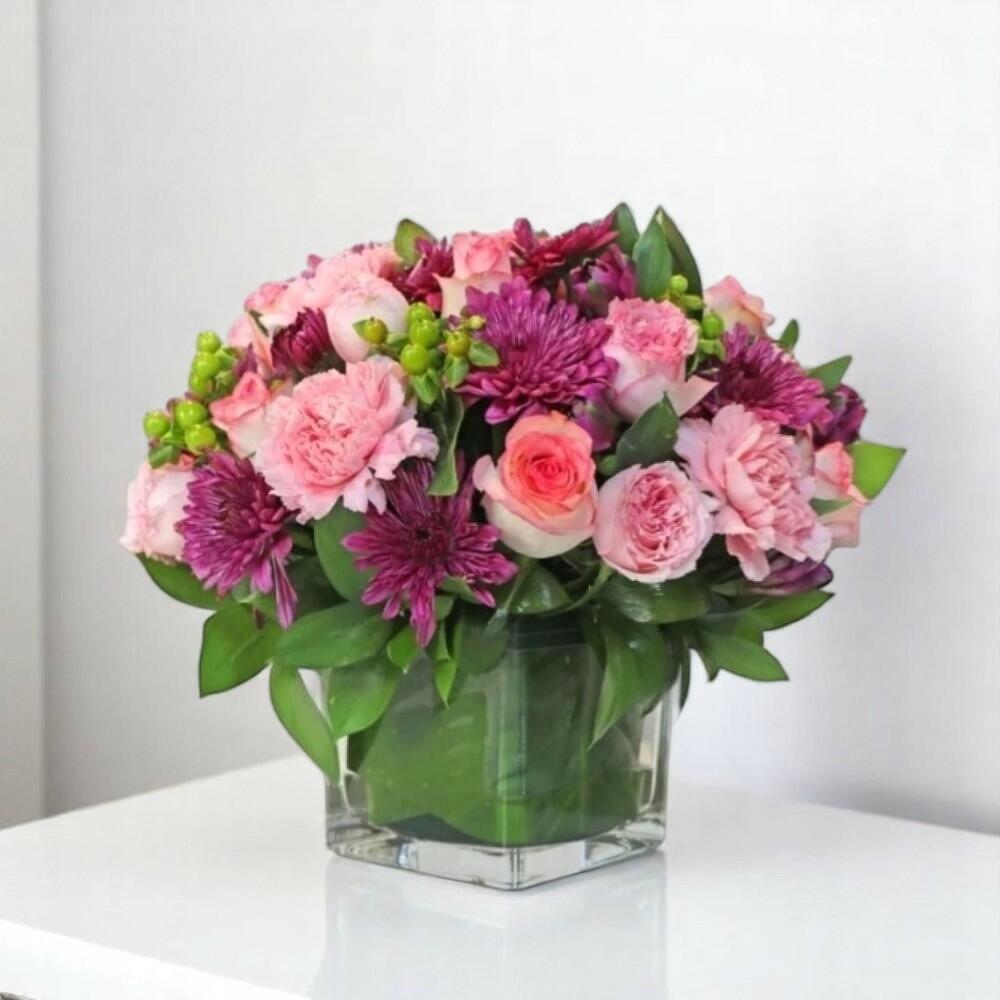 Эта сияющая цветочная композиция сочетает в себе нежное очарование и всплеск смелого цвета, всё элегантно оформлено в прозрачной стеклянной вазе. В композиции — нежно-розовые розы и гвоздики, яркие фуксиевые хризантемы и ярко-зелёные ягоды, расположенные среди пышной зелени; это прекрасный подарок для любого торжества или жизнерадостное дополнение к декору. Идеально подходит для дней рождения, пожеланий скорейшего выздоровления или просто чтобы скрасить чей-то день — этот букет сочетает в себе свежесть и элегантность. Чтобы продлить красоту ваших цветов, меняйте воду каждые два дня, срезайте стебли под углом и держите их вдали от прямых солнечных лучей и источников тепла.