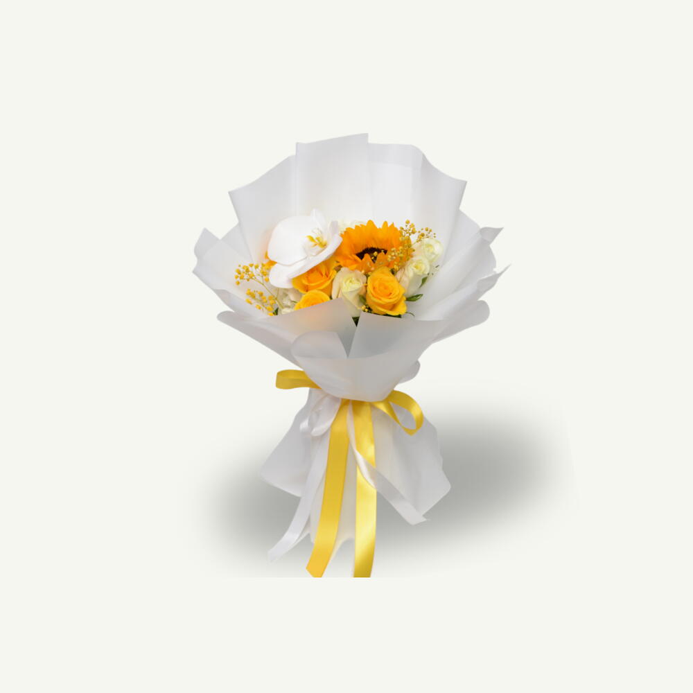 Букет, собранный вручную из 1 подсолнуха, 1 белой орхидеи, 1 белой гортензии, 5 желтых роз, 3 белых роз и желтой гипсофилы, бережно упакован в белую обертку для свежего и сияющего вида.