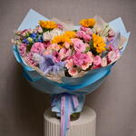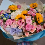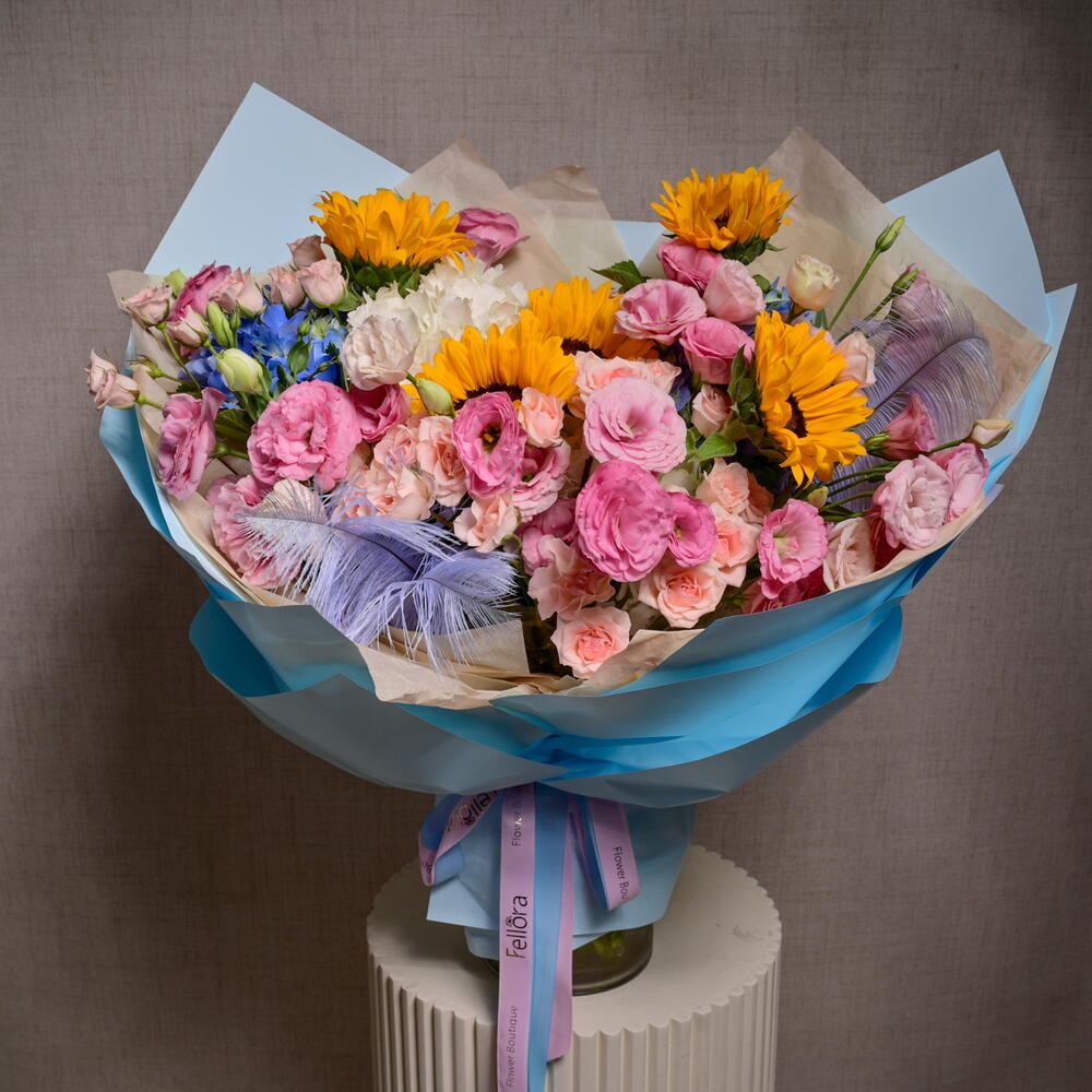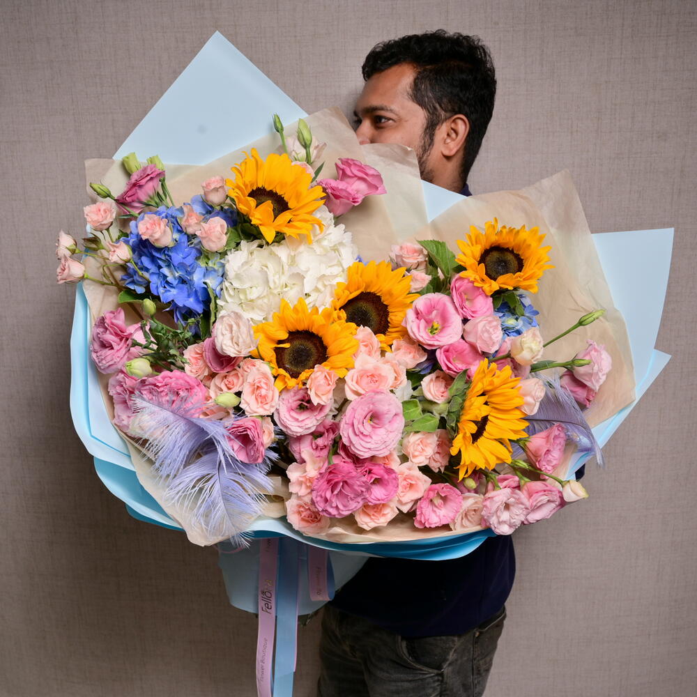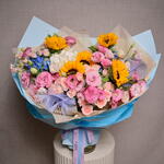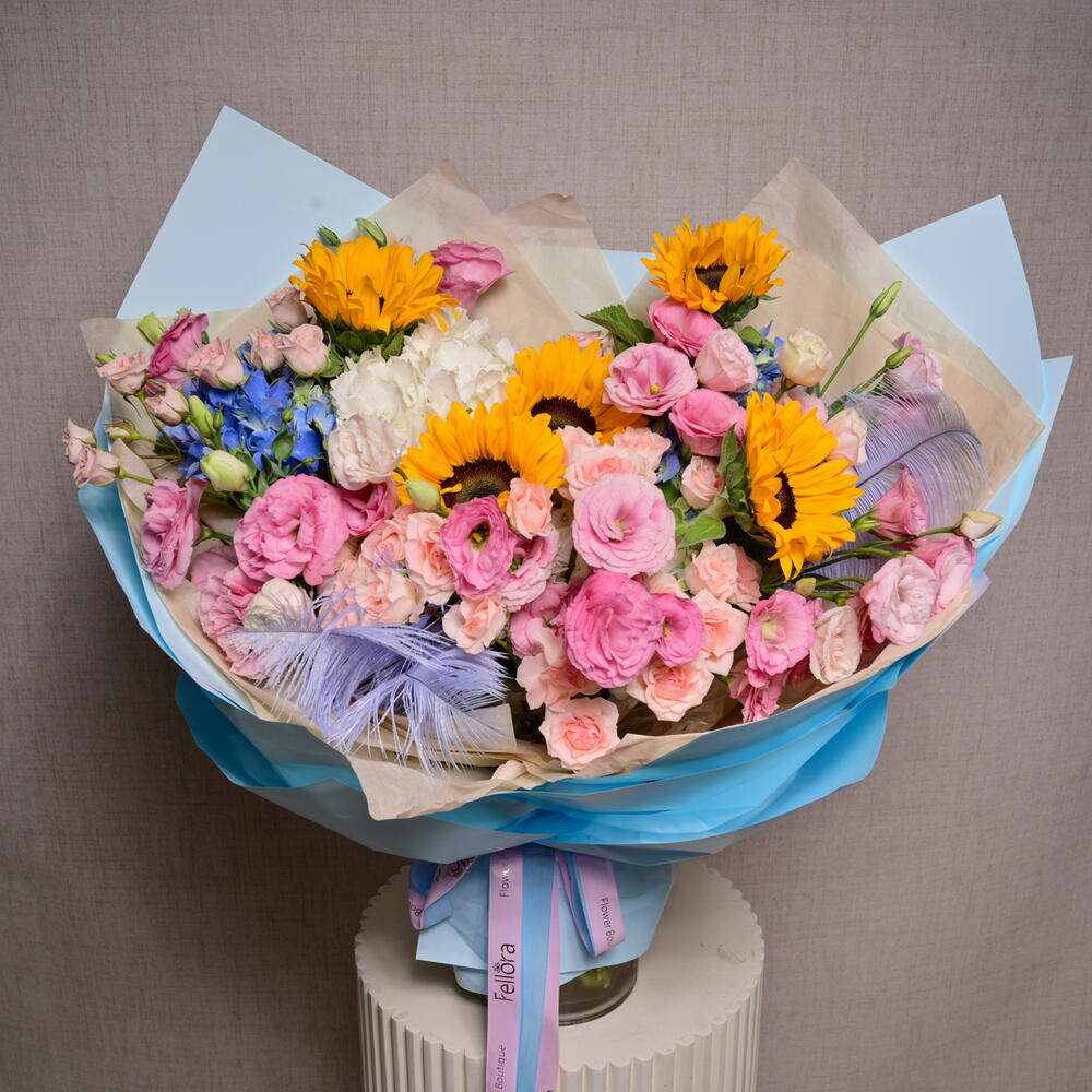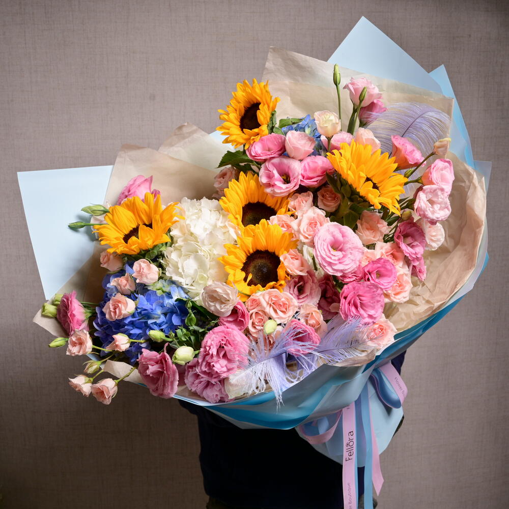 sunflowers - 5 шт. blue hydrangea - 3 шт. wrapping paper - 9 шт. lisianthus pink - 15 шт. white hydrangea - 2 шт. кустовые розы sweet sara - 11 шт. синее перо - 3 шт.