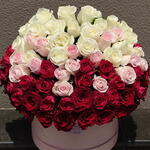 Летнее солнце: 80 стеблей смешанных роз в розовой круглой коробке 20 стеблей красных роз, 20 стеблей тёмно-розовых роз, 20 стеблей белых роз и 20 стеблей светло-розовых роз в розовой круглой коробке с односторонним оформлением.