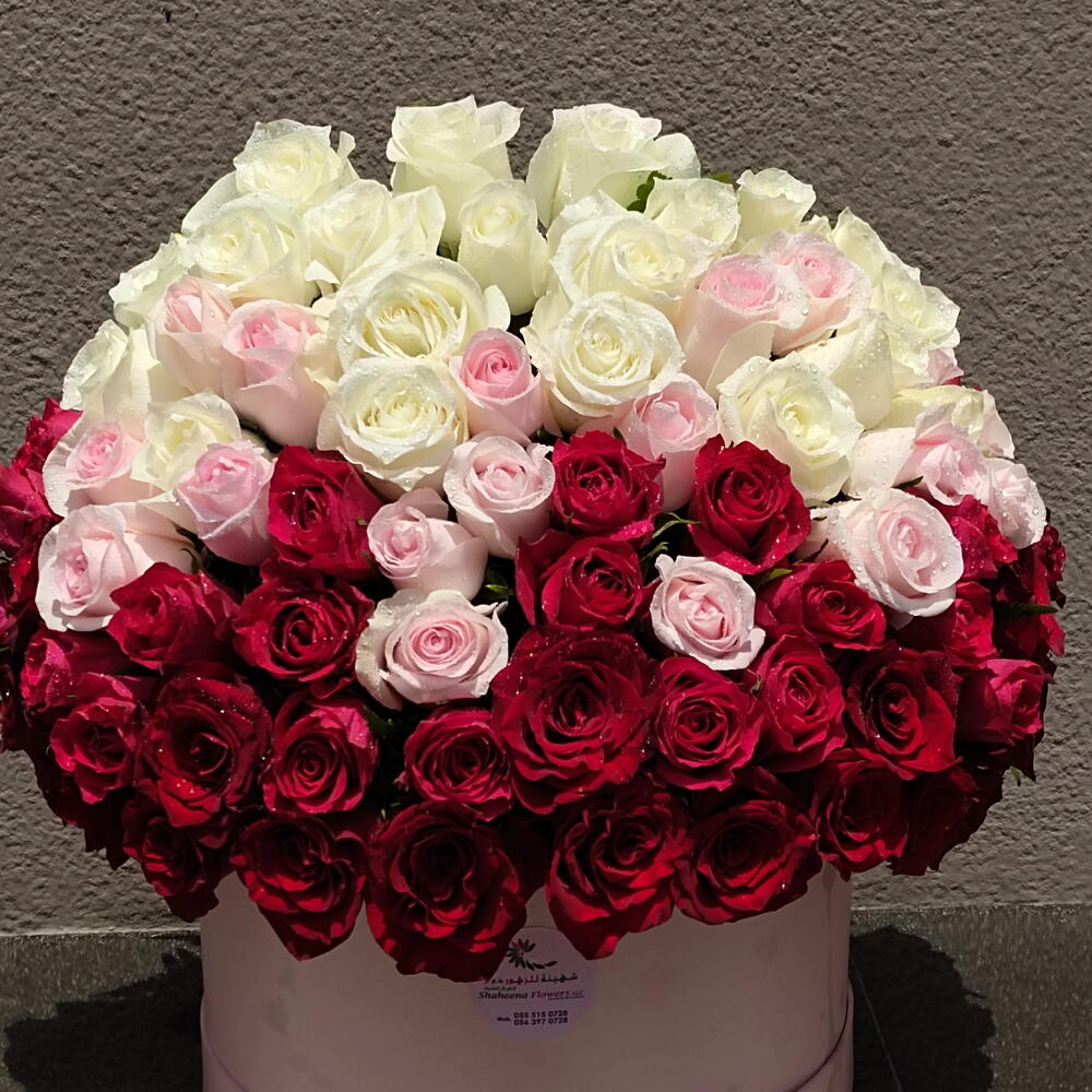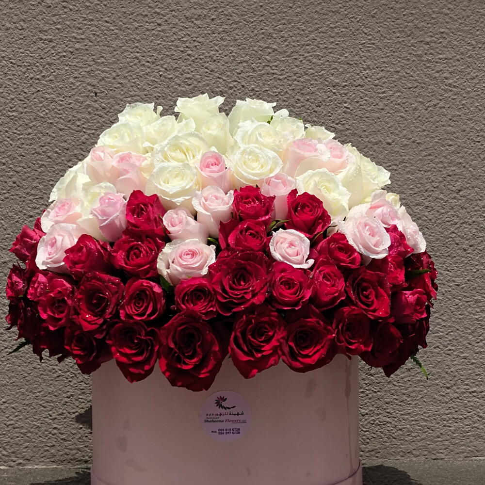 Летнее солнце: 80 стеблей смешанных роз в розовой круглой коробке 20 стеблей красных роз, 20 стеблей тёмно-розовых роз, 20 стеблей белых роз и 20 стеблей светло-розовых роз в розовой круглой коробке с односторонним оформлением.