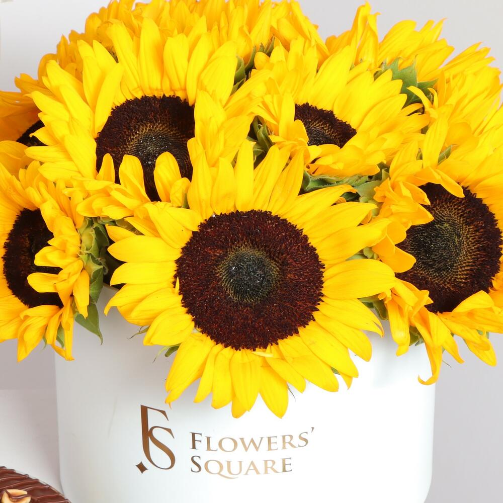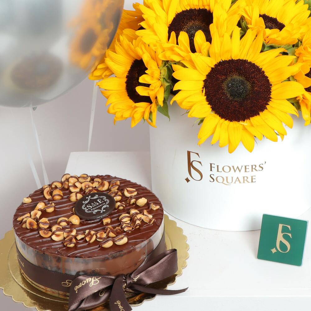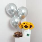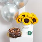 Удивите своих близких нашим специальным выгодным пакетом! Наша коробка с подсолнухами, ореховый фадж-кейк и 3 серебристых гелиевых шара сделают ваш праздник незабываемым. Сладкий и сливочный вкус орехового фадж-кейка, приготовленного из лучших ингредиентов, порадует ваши вкусовые рецепторы, а серебристые гелиевые шары создадут воздушную атмосферу. Мы сделаем ваш праздник незабываемым.