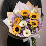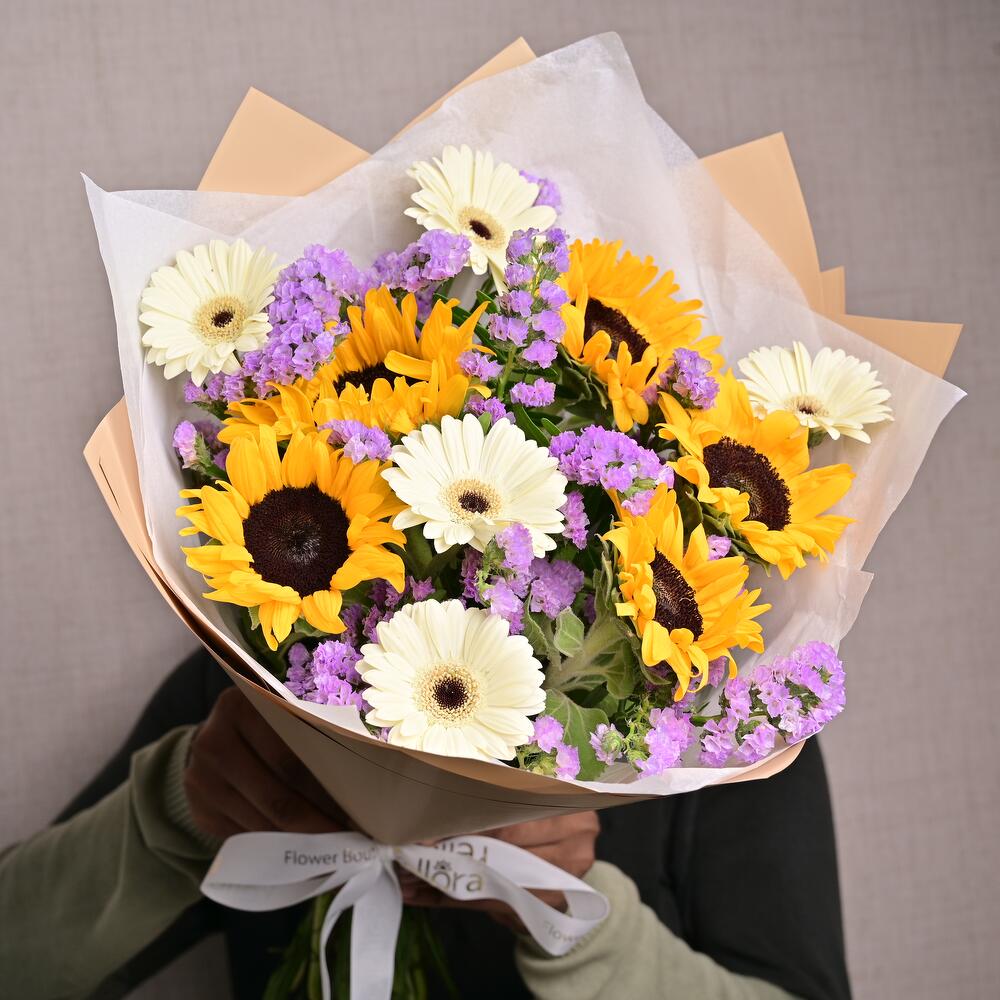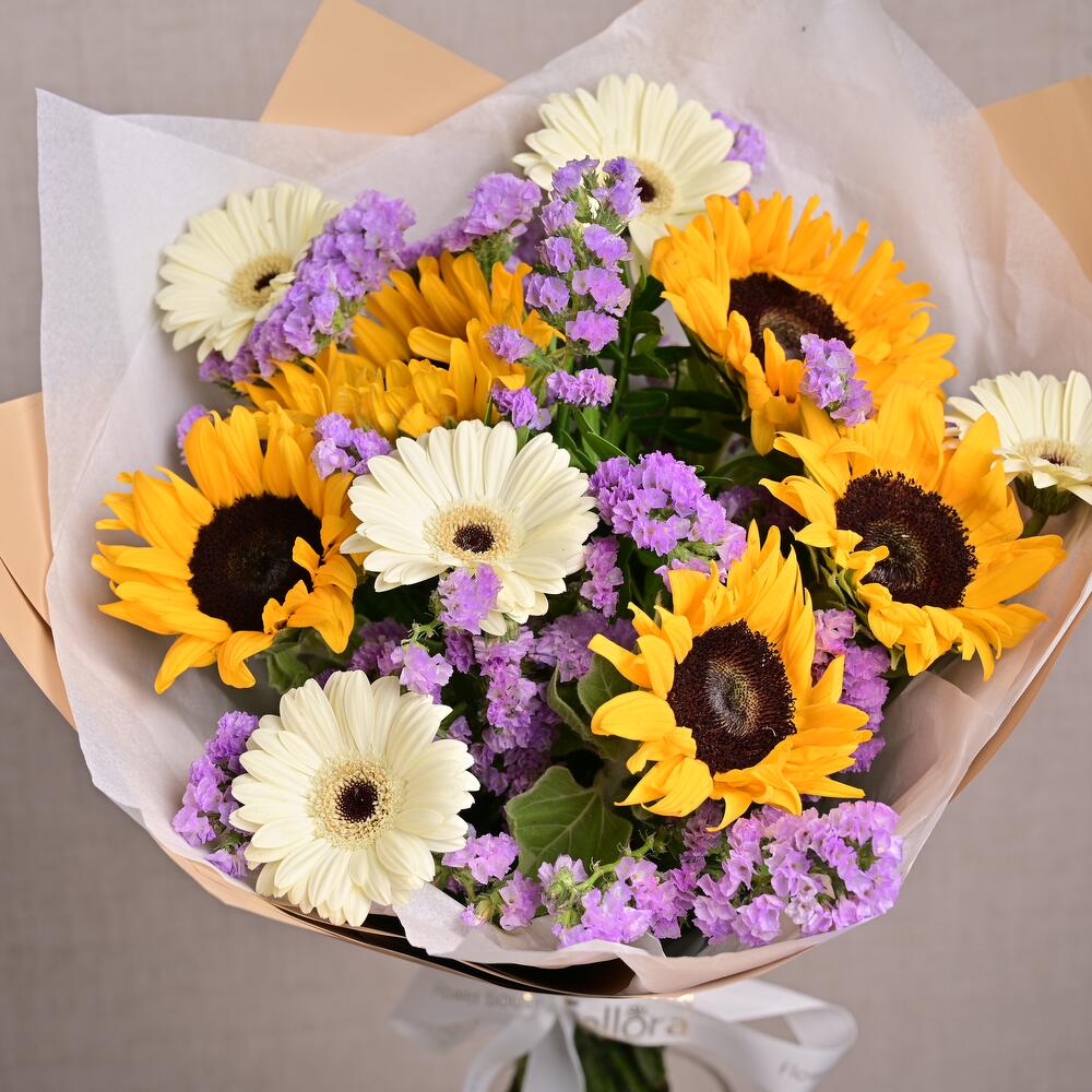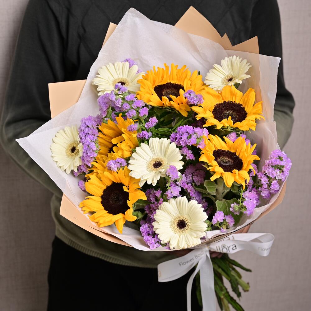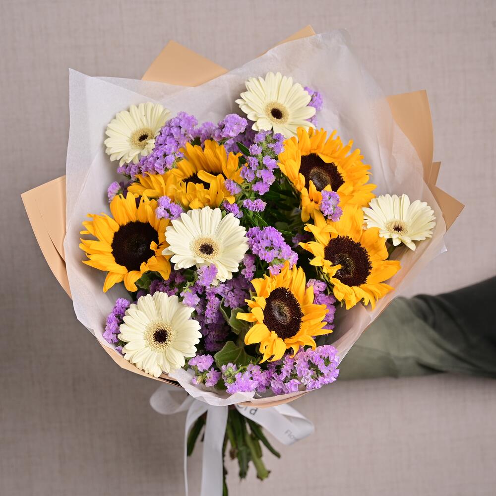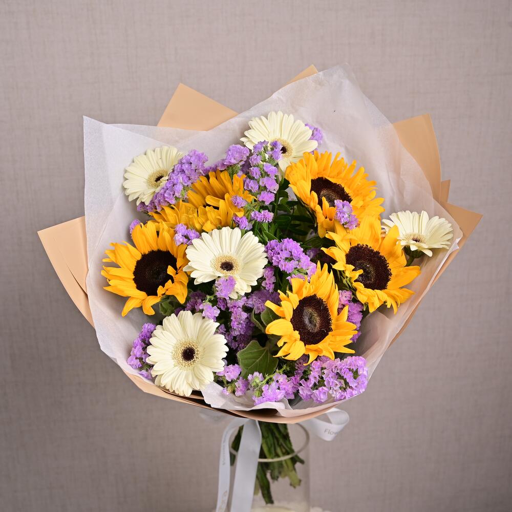 Смелый микс из 5 подсолнухов, 5 белых гербер и 2 стебля статицы. Яркий и эффектный букет, идеален для праздников и в подарок.