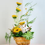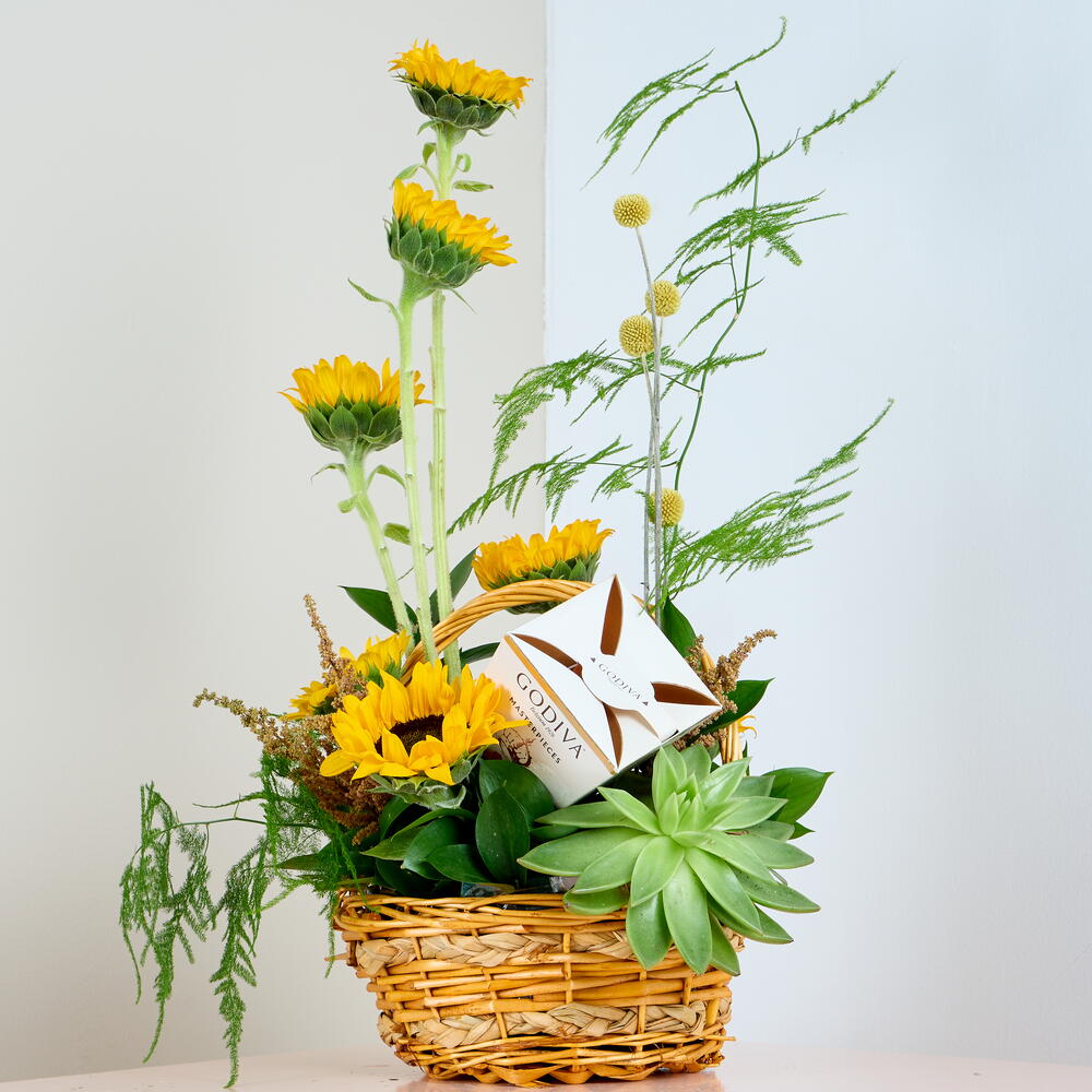 Ruscus - 3 шт. Basket - 1 шт. Sunflower - 6 шт. asparagus - 3 шт. astilbe - 1 шт. echeveria - 1 шт. craspedia - 4 шт. Годива - 1 шт.
