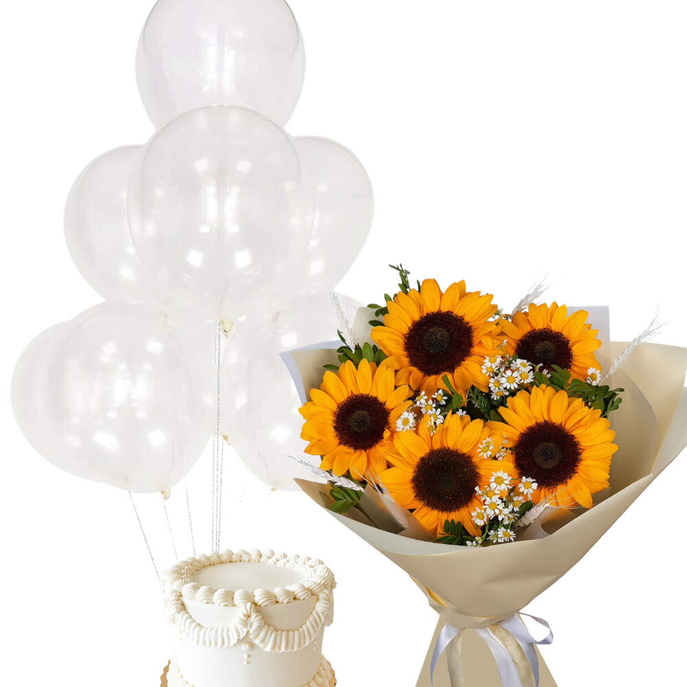 Sunflower - 5 шт. tanacetum - 3 шт. воздушные шары - 8 шт. ванильный торт - 1 шт.