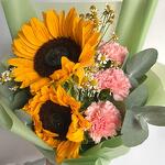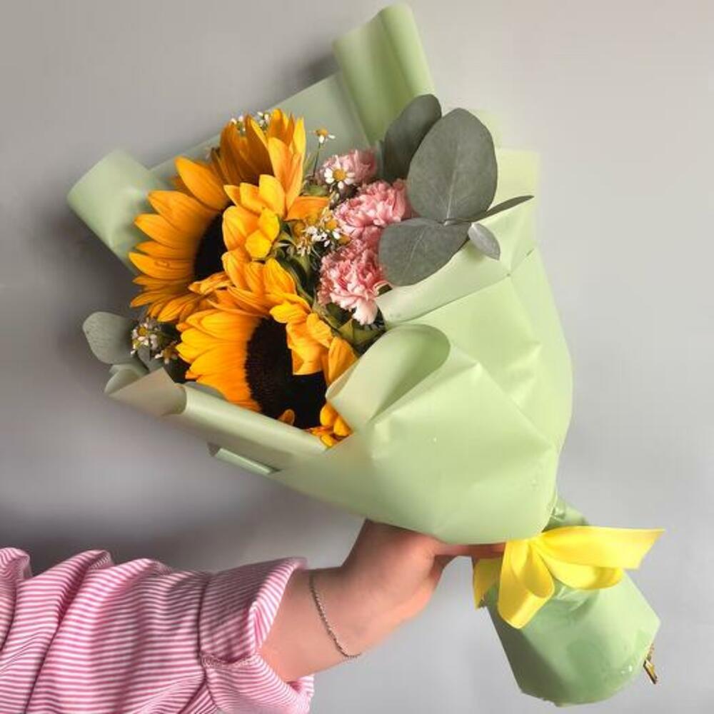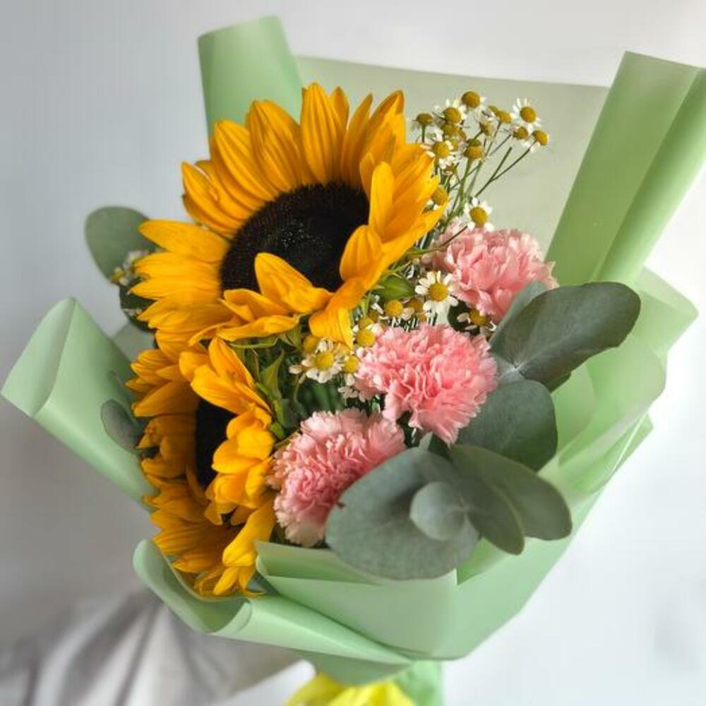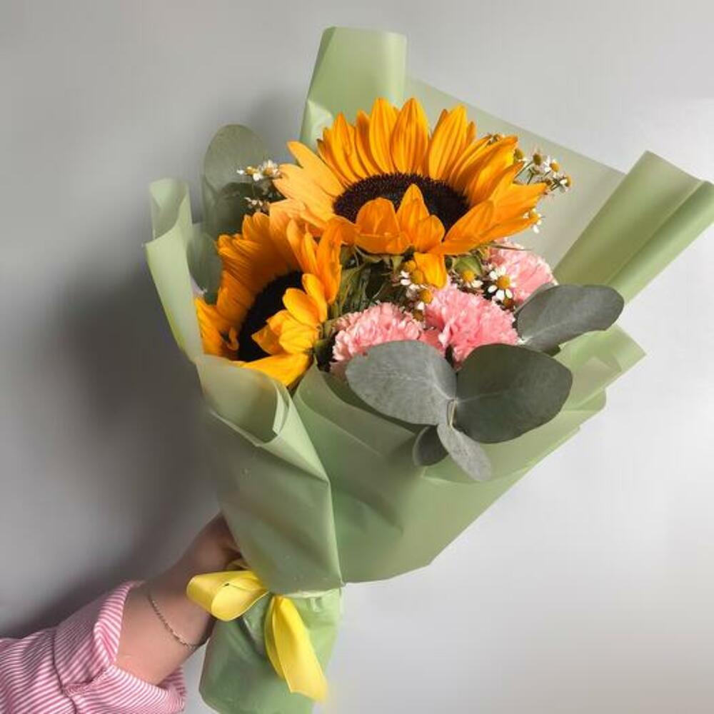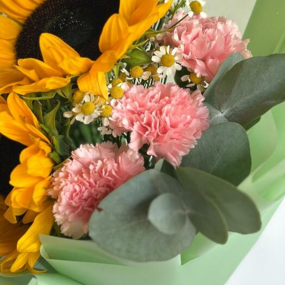 Наш букет — уникальное творение, созданное, чтобы удивлять и очаровывать. С сияющими подсолнухами, нежными розовыми гвоздиками и жизнерадостными ромашками этот букет — идеальное дополнение к любому поводу. Игривое сочетание цветов и фактур вызывает ощущение тепла и радости, превращая его в идеальный подарок, способный сделать чей-то день светлее. Созданный вручную с любовью, этот букет доставляется красиво оформленным и готов дарить улыбки и солнечное настроение.
