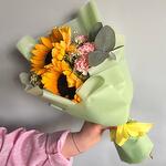 Satin ribbon - 1 шт. Eucalyptus - 1 шт. Sunflower - 2 шт. carnation - 3 шт. tanacetum - 2 шт. дизайн упаковки - 1 шт.