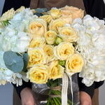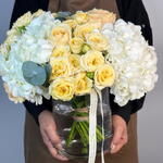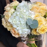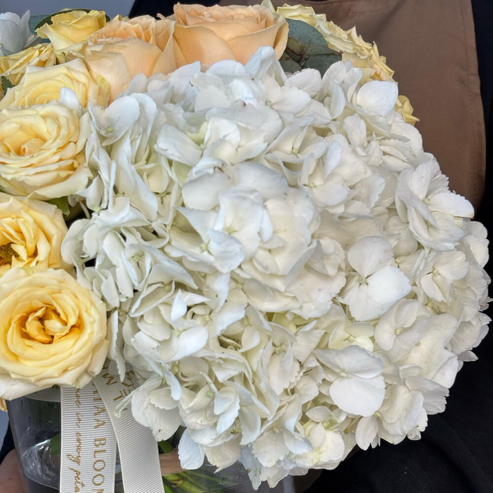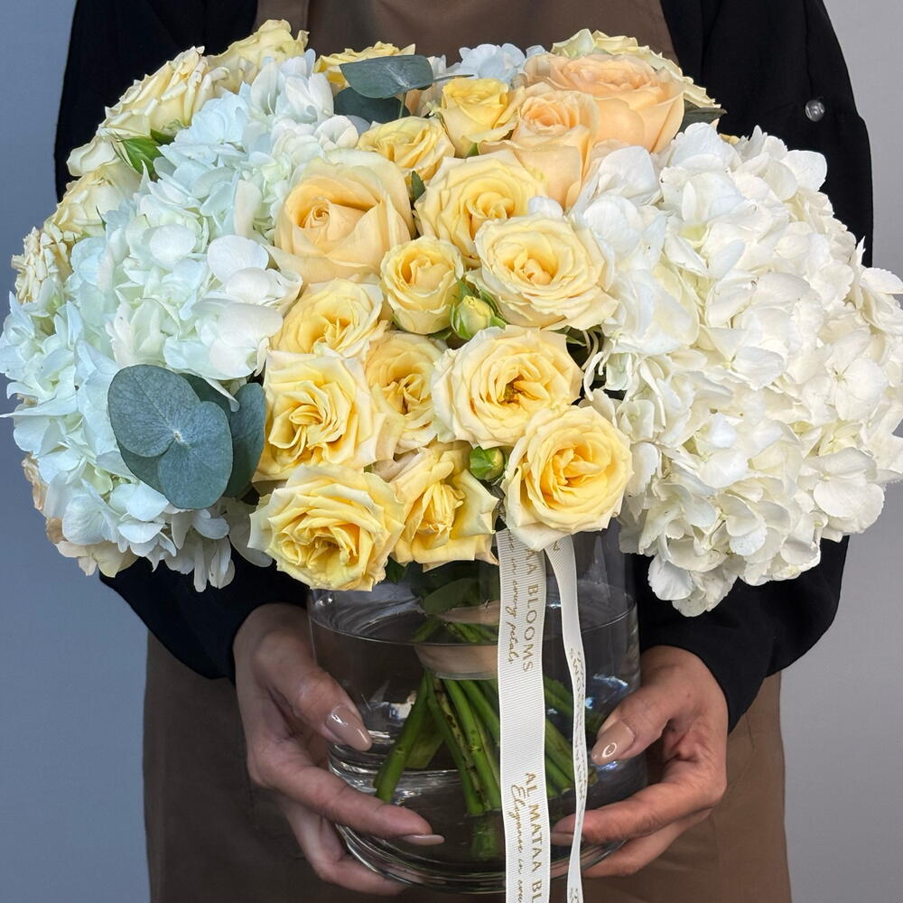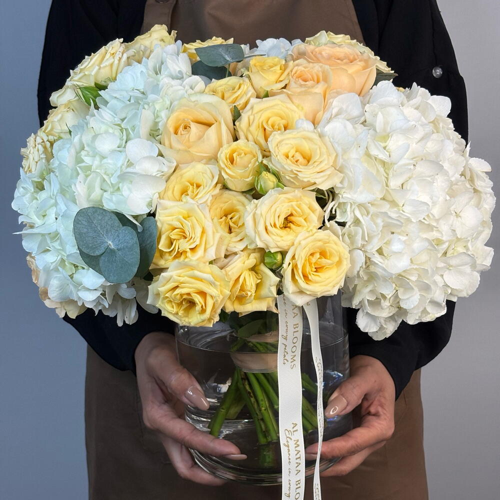 rose avalanche - 7 шт. ветки эвкалипта - 5 шт. спрей-роза solinero - 6 шт. набор питания для цветов - 1 шт. цилиндрическая ваза 15 см / 20 см - 1 шт. премиум белая гортензия - 3 шт.