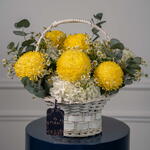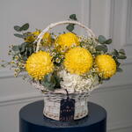 Eucalyptus - 4 шт. hydrangea white - 3 шт. tanacetum - 5 шт. хризантема пионы жёлтый - 5 шт.