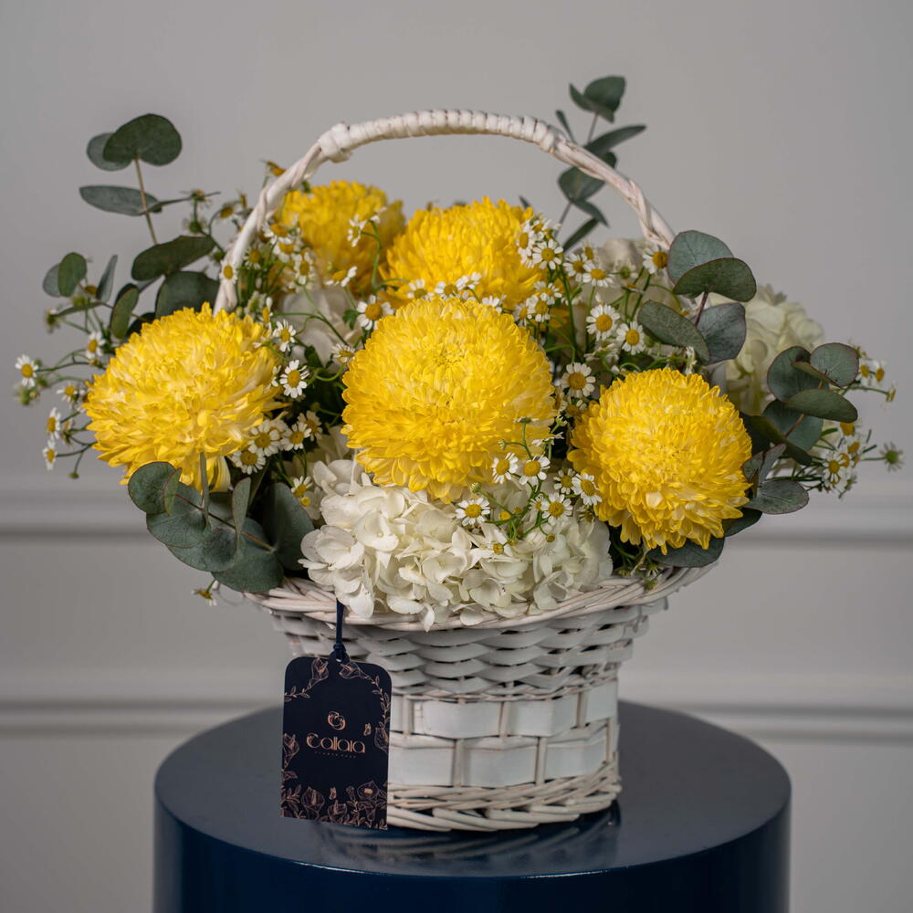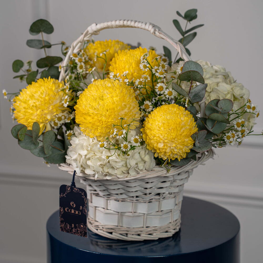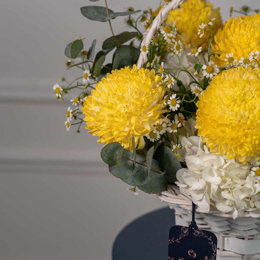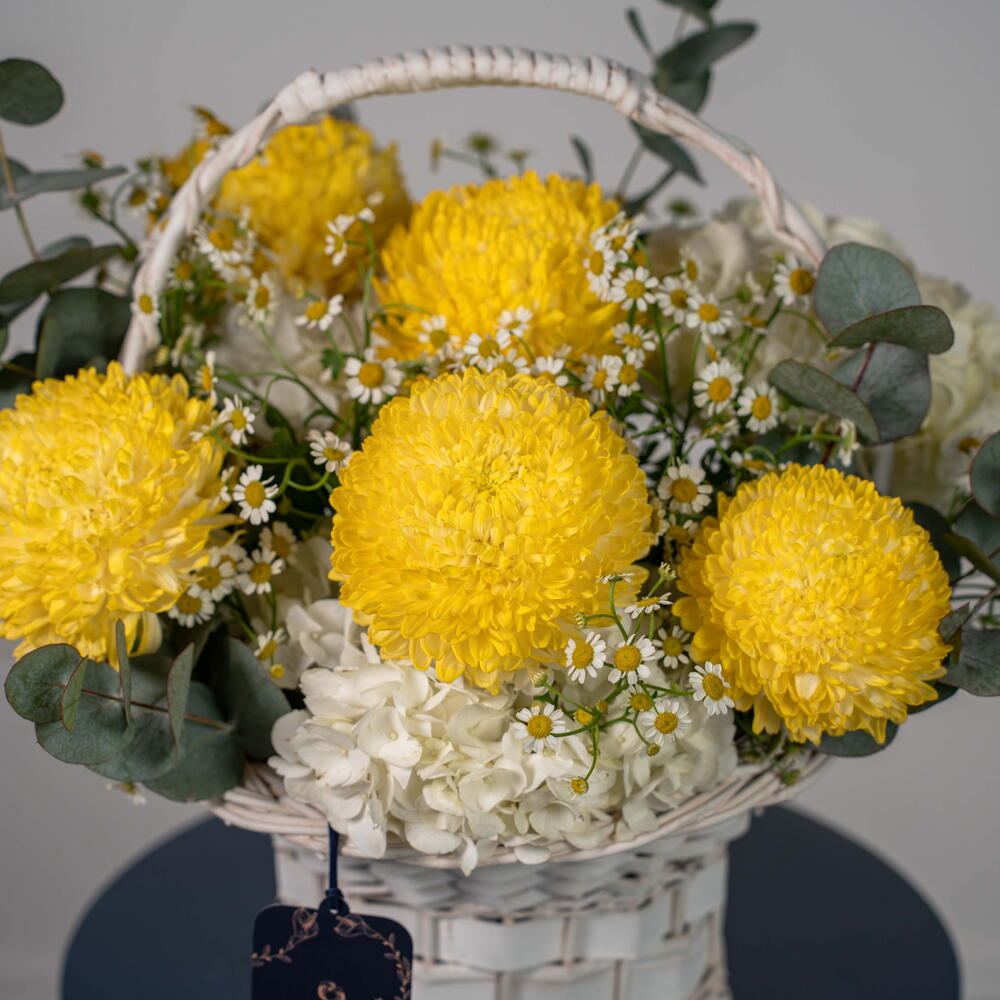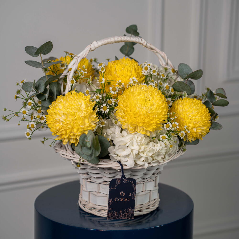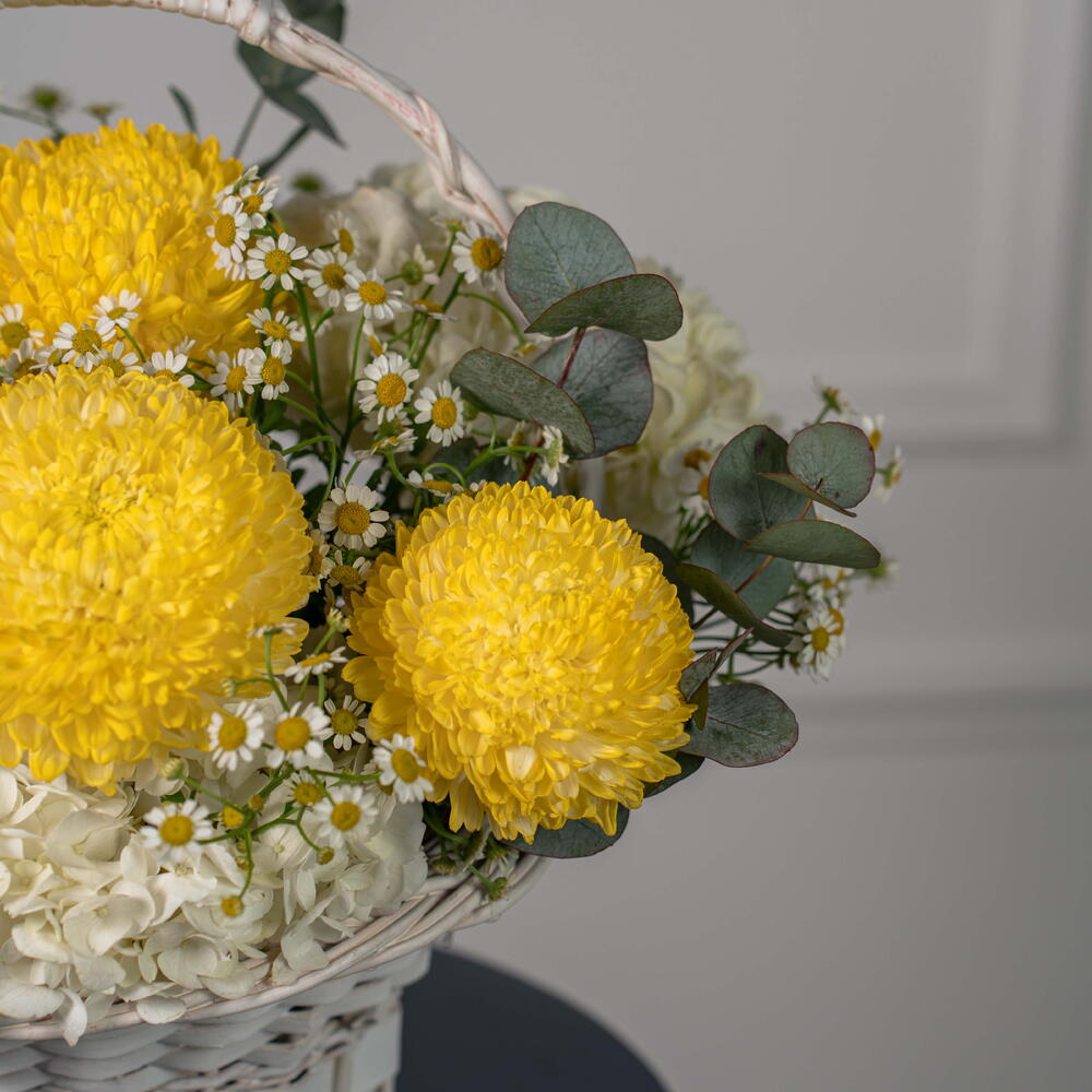 Eucalyptus - 4 шт. hydrangea white - 3 шт. tanacetum - 5 шт. хризантема пионы жёлтый - 5 шт.