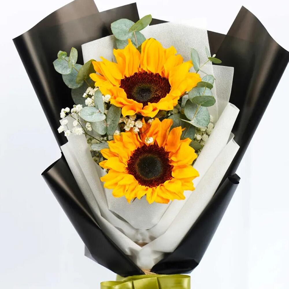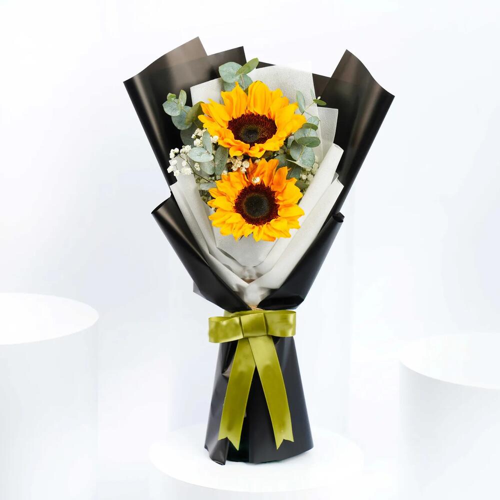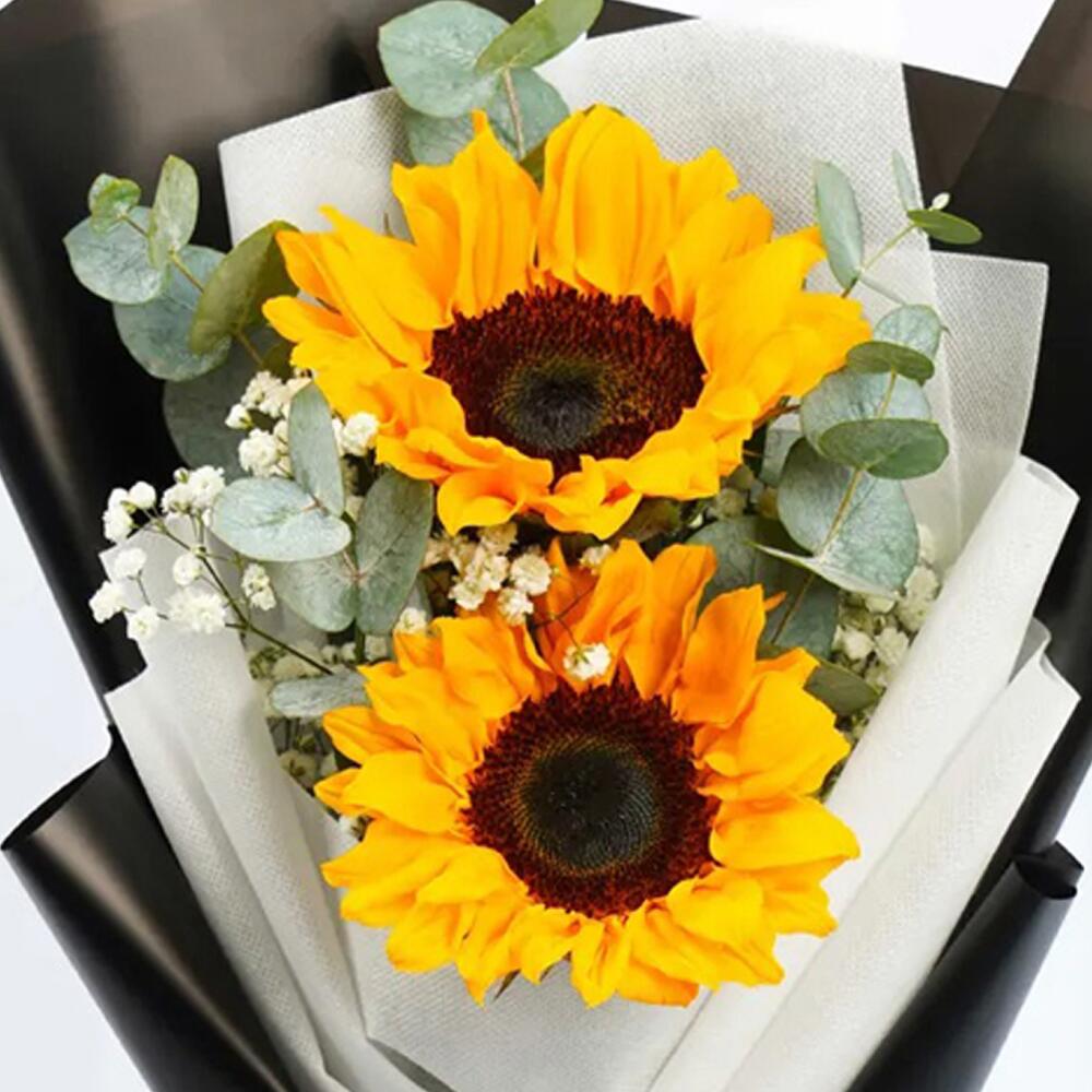 Жизнерадостная пара золотистых подсолнухов, излучающих тепло, позитив и радость. Собранный вручную со свежей зеленью, этот простой, но яркий букет идеально подходит, чтобы осветить чей-то день, отпраздновать дружбу или подарить лучик солнца по любому поводу.
