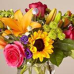 Солнечный микс цветов в стеклянной вазе