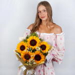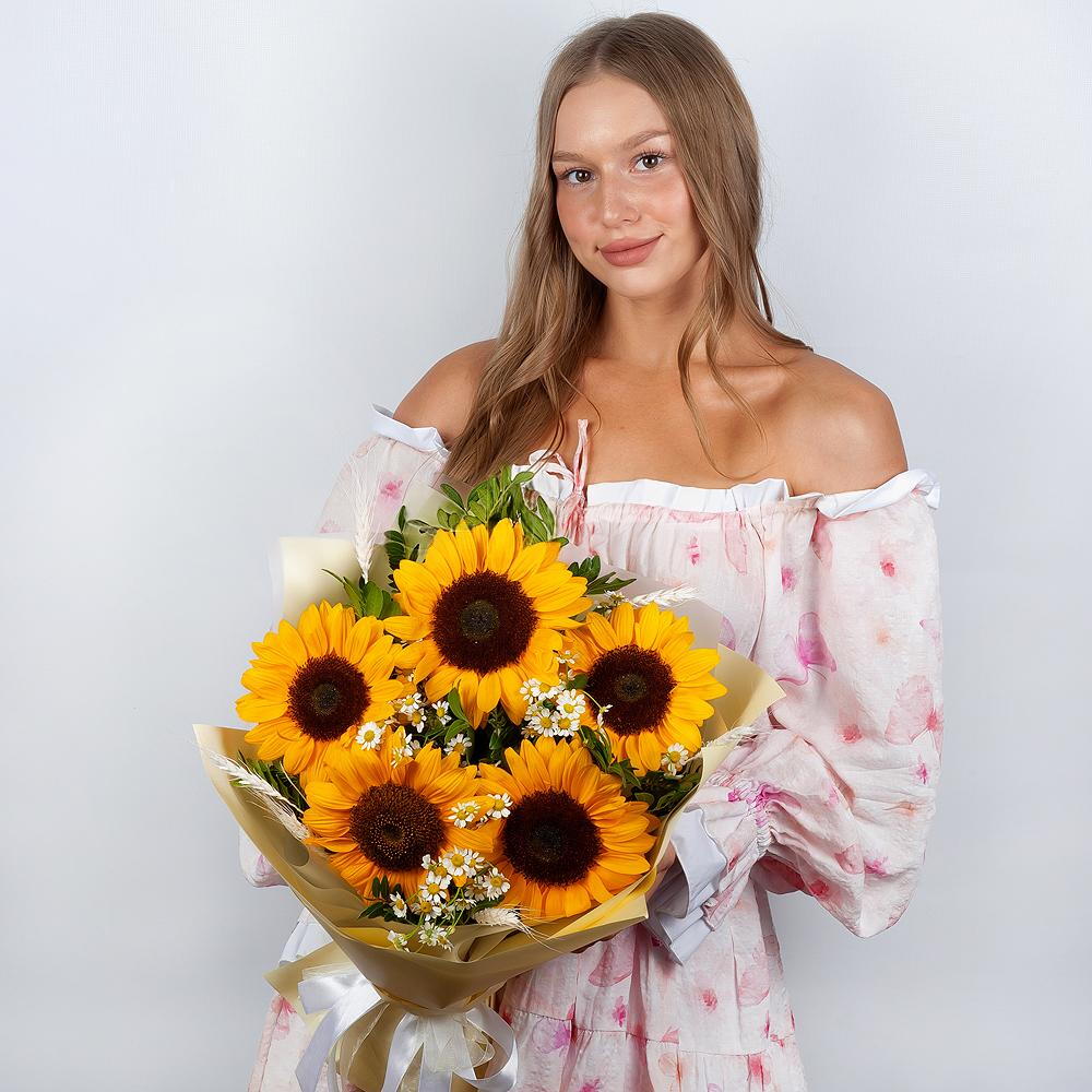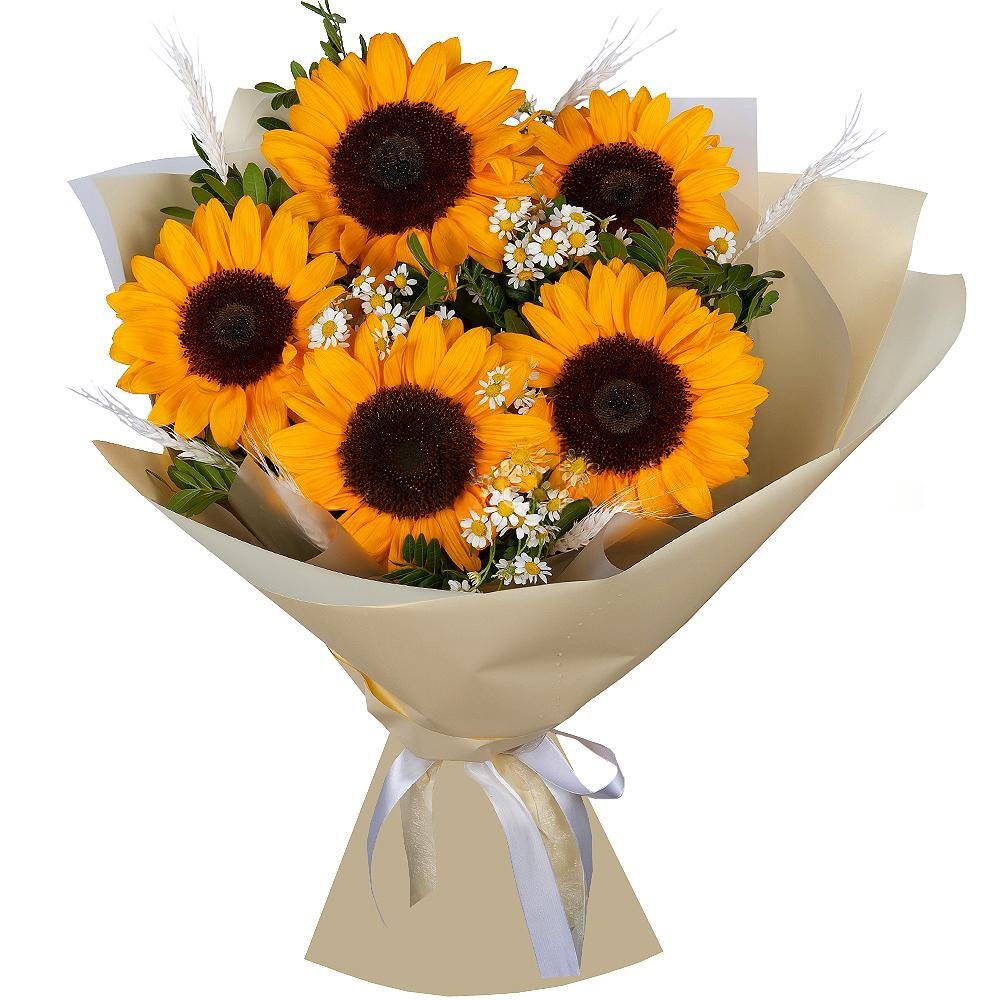 5 подсолнухов, 3 стебля ромашки, 3 фисташковых листа в кремовой упаковке