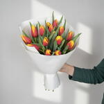 «Солнечная искра» — это жизнерадостный монобукет из пятнадцати ярких красных и желтых тюльпанов, расположенных в компактной, но выразительной композиции. Огненно-красные тона в сочетании с солнечными желтыми создают живой контраст, символизирующий радость, тепло и позитивную энергию. Этот букет станет приятным сюрпризом не только на Международный женский день, но и в любой обычный день, заслуживающий ярких красок. Свежие весенние цветы мгновенно оживляют атмосферу и дарят ощущение легкости и счастья. Идеально подходит в качестве подарка партнеру, матери, подруге, дочери, учителю или коллеге, эта композиция передает сияющее послание заботы и признательности. Свежий, красочный и воодушевляющий — небольшой букет с большим эмоциональным воздействием.
