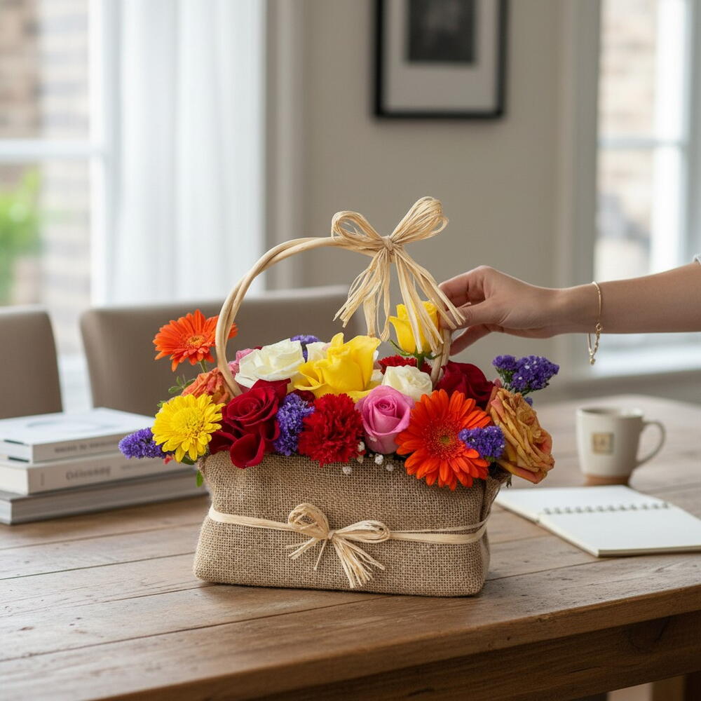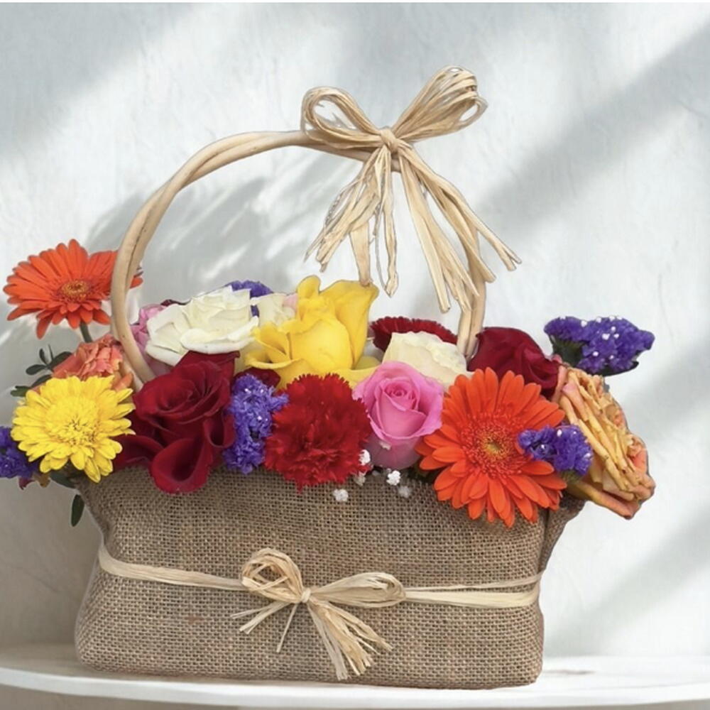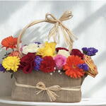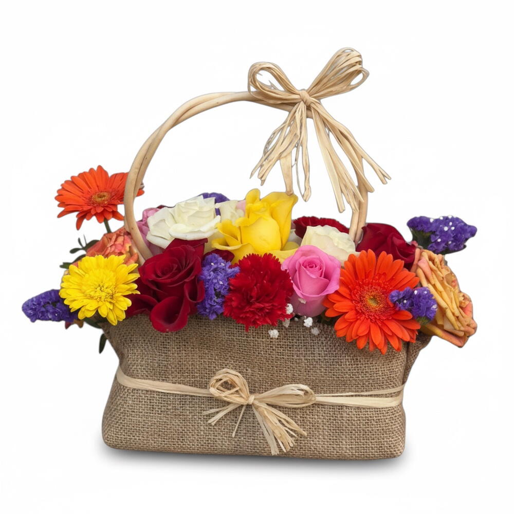 Очаровательная корзинная композиция с 11 разноцветными розами, 2 яркими оранжевыми герберами и 2 ярко-красными гвоздиками, красиво упакована в натуральный джут. Это потрясающее сочетание тёплых оттенков и фактур излучает радость, элегантность и вечную красоту. Сохраняйте свежесть цветов, подрезая стебли под углом, меняя воду ежедневно и ставя их в прохладное место, вдали от прямых солнечных лучей и сквозняков 25 X 30