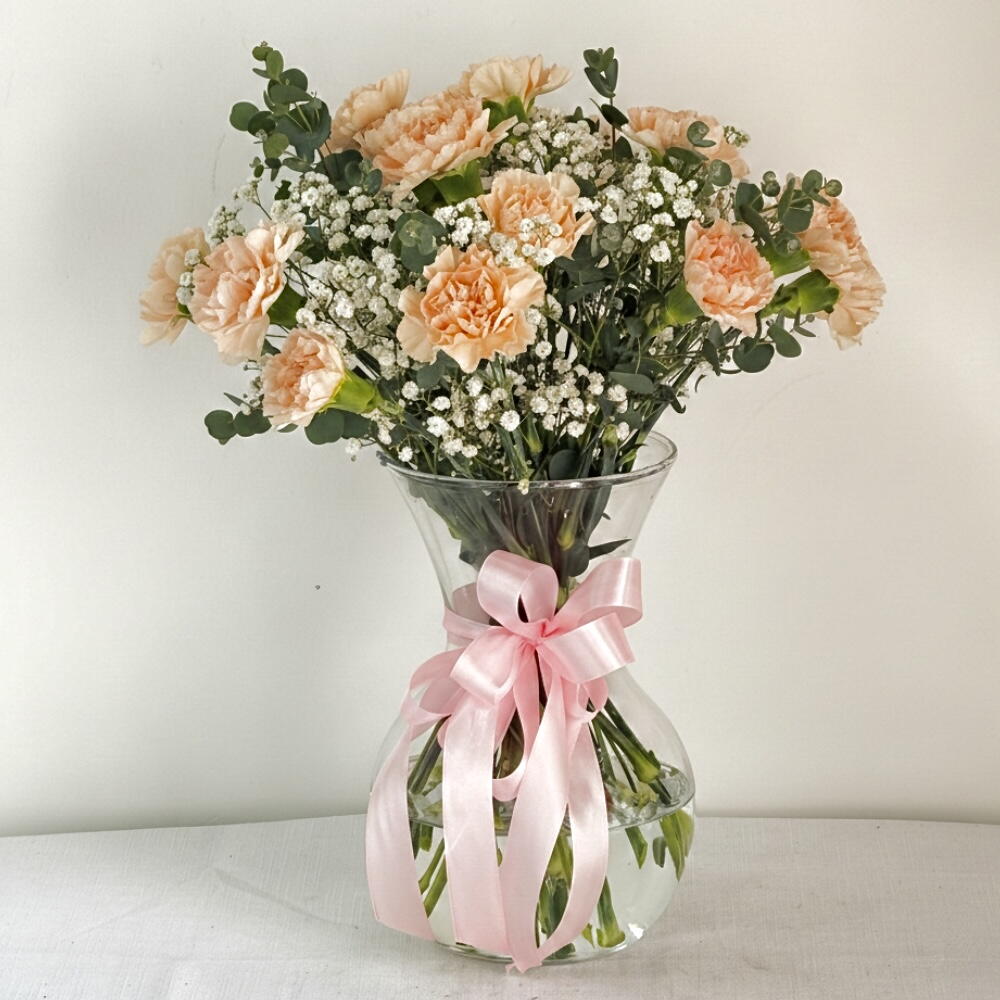 Пятнадцать ярких оранжевых гвоздик в прозрачной вазе, излучающих тепло и положительную энергию. Идеально для дней рождения, поздравлений или жизнерадостного декора.