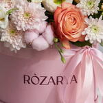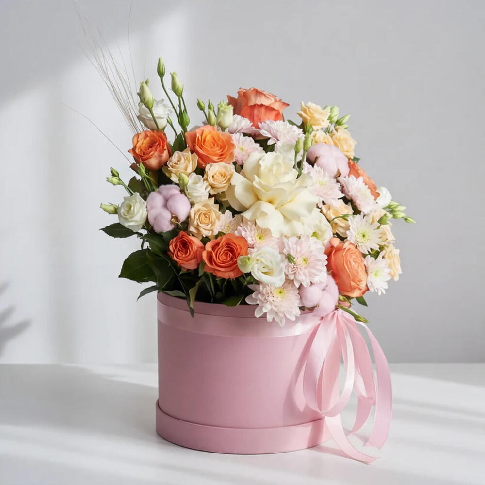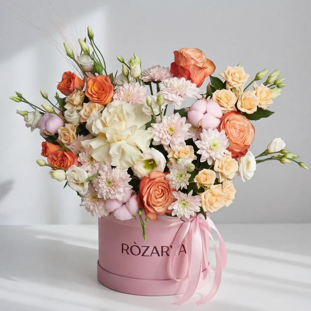 оранжевые премиум-розы - 8 шт. signature pink ròzarya hatbox - 1 шт. премиальные персиковые спрей-розы - 6 шт. кремовый премиум лизиантус - 5 шт. нежно-розовые хризантемы - 5 шт. натуральные хлопковые коробочки, окрашенные в розовый - 3 шт.