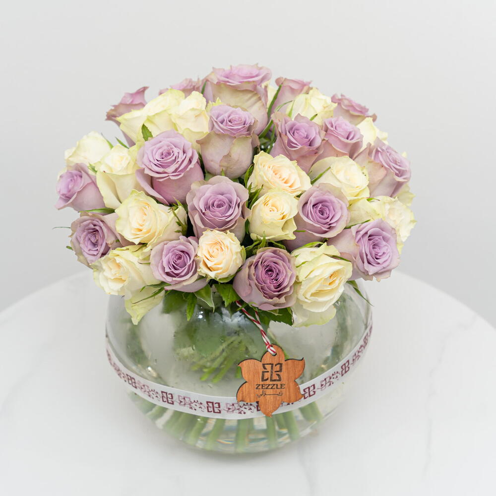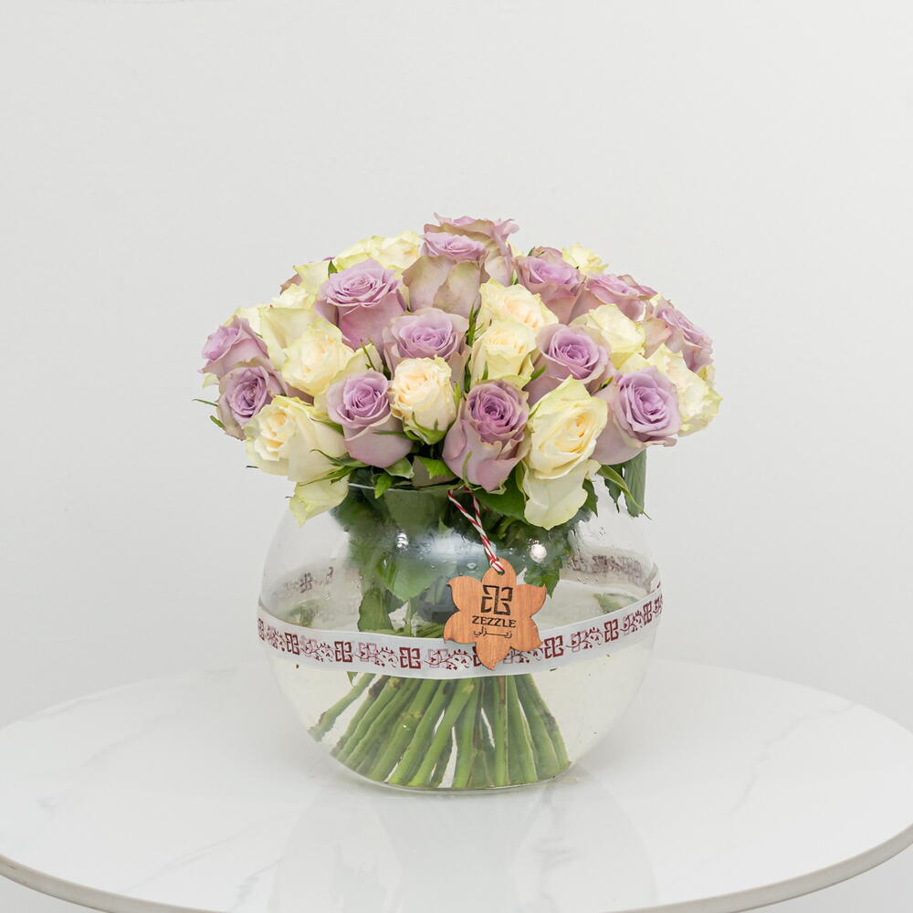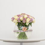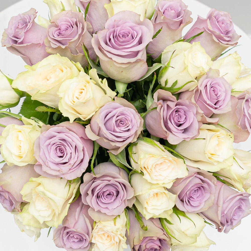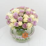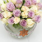 Классическая и элегантная композиция: в этом букете представлены 10 роскошных фиолетовых роз и 10 безупречно белых роз, красиво выставленных в стеклянной чаше. Контрастные цвета создают потрясающую и романтичную композицию, идеально подходящую для выражения любви и восхищения.