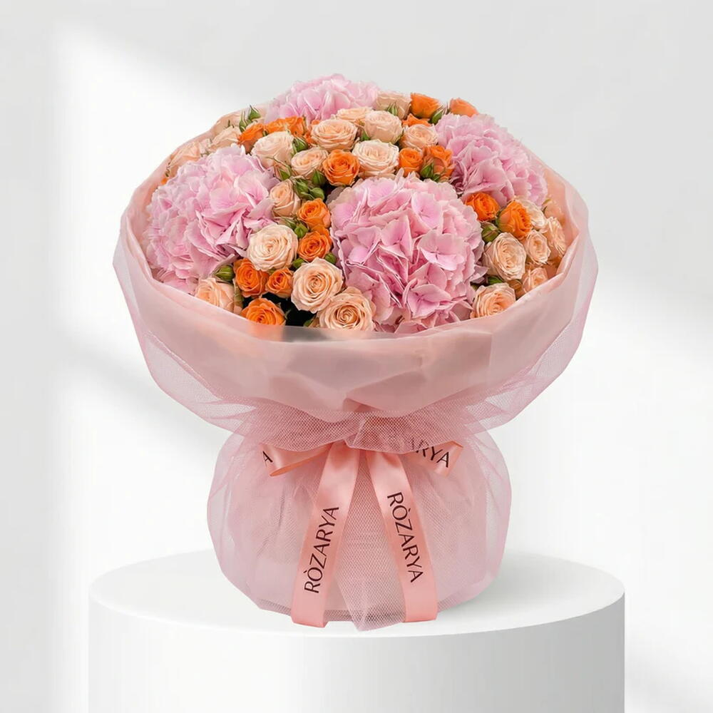 Свежий и романтичный букет в мягких розовых, персиковых и тёплых абрикосовых тонах, составленный из пышной гортензии и нежных спрей-роз. Яркий, но элегантный, этот букет — прекрасный выбор на день рождения, на День матери и в качестве продуманного подарка.