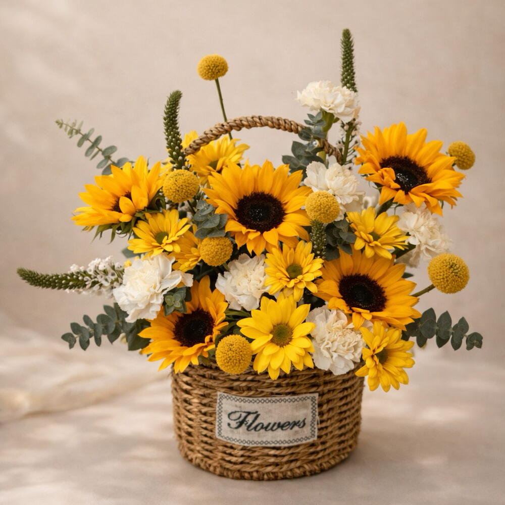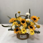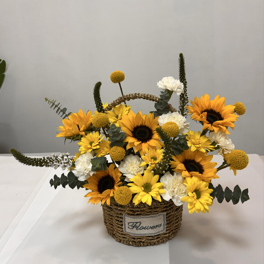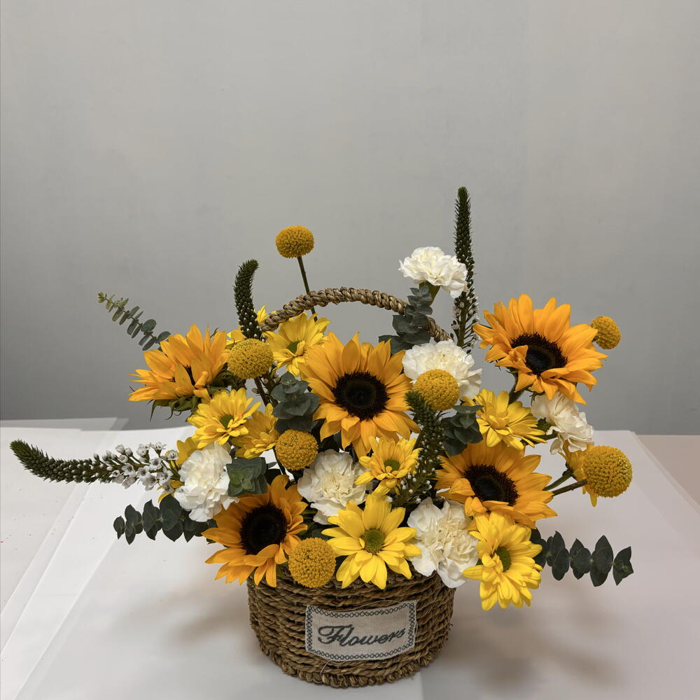 Basket - 1 шт. Sunflower - 5 шт. carnation - 6 шт. craspedia - 7 шт. Baby Blue - 1 шт. лисимахия - 5 шт. сантини маргаритка - 2 шт.