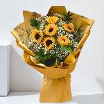 Букет «Цветущее солнце» – это сияющее торжество радости, тепла и природной красоты. Шесть золотистых подсолнухов символизируют позитив и счастье, что делает этот букет идеальным подарком, который сделает любой день ярче. Пять веточек нежной гипсофилы, также известной как «Депрессия», дополняют композицию, добавляя ей нежности и мечтательности. Пять пышных листьев рускуса привносят свежесть и яркую зелень, усиливая визуальную гармонию букета. Композиция, оформленная в элегантную золотистую бумагу, идеально подходит для дней рождения, поздравлений или просто для того, чтобы подарить искреннюю улыбку. Букет «Цветущее солнце» воплощает в себе суть солнечного света и радости, привнося в любое пространство нотку золотого сияния. Яркие желтые подсолнухи идеально сочетаются с нежным, словно облако, видом гипсофилы и освежающей зеленью листьев рускуса. Это творение флориста излучает энергию, оптимизм и элегантность, что делает его продуманным и вдохновляющим подарком на любой случай. Инструкция по уходу: Чтобы букет оставался свежим, поместите стебли в чистую воду сразу после получения. Обновляйте воду каждые два дня и подрезайте стебли по диагонали для лучшего увлажнения. Храните букет в прохладном месте, вдали от прямых солнечных лучей, источников тепла и спелых фруктов. При правильном уходе букет «Солнечный цвет» будет излучать красоту и радость в течение многих дней.