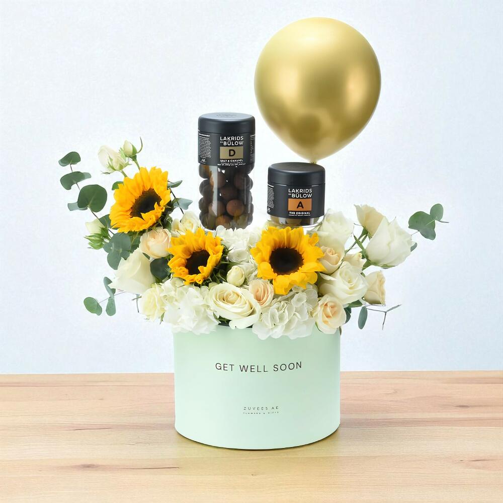 Яркая, жизнерадостная и полная продуманной роскоши — подарочная коробка Sun Bloom – Lakrids A D с золотым шаром сочетает солнечные цветы с гурманскими угощениями, чтобы поднять настроение и отпраздновать особые моменты.
