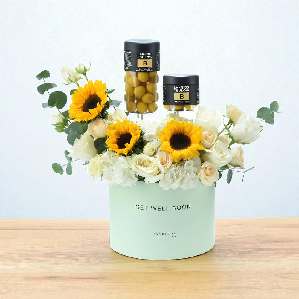 Сделайте их путь к выздоровлению ярче с Sunshine Joy Lakrids Box — сияющей цветочной композицией в сочетании с неотразимым вкусом шоколадных конфет Lakrids by Bülow B – Passion Fruit в размерах Small и Regular.