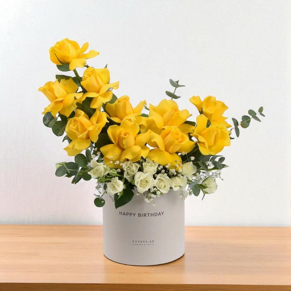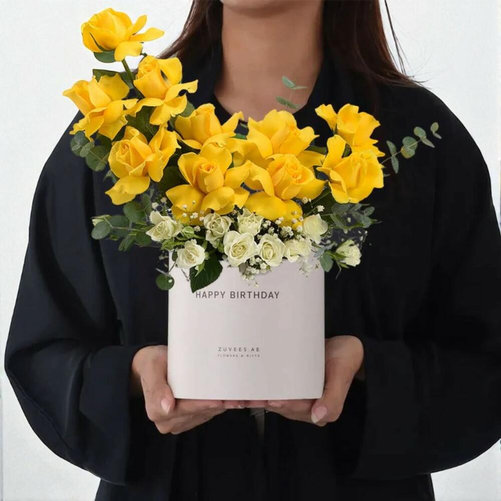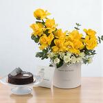 Отпразднуйте особые моменты жизни с коробкой «Солнечные снежинки» – яркой и трогательной цветочной композицией в сочетании с роскошным шоколадным тортом. Эта подарочная коробка, создающая эффектный контраст ярких жёлтых роз и нежных белых кустовых роз с гипсофилой, символизирует дружбу, тепло и радостное начало – всё это красиво оформлено в круглой коробке с надписью «С днём рождения». Этот набор идеально подходит для дней рождения, трогательных сюрпризов или радостных праздников, предлагая свежесть и аромат в одном незабываемом подарке. Инструкция по уходу Чтобы цветы дольше оставались свежими, поместите коробку в прохладное, затенённое место, вдали от прямых солнечных лучей, обогревателей и вентиляционных отверстий кондиционера. Слегка поливайте флористическую губку каждые 1–2 дня, наливая немного воды рядом со стеблями. Не переувлажняйте коробку, чтобы сохранить целостность. Храните торт в прохладном месте или в холодильнике до подачи.