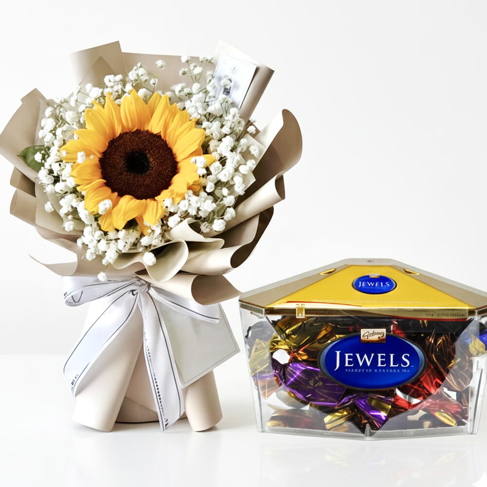 Весёлый букет подсолнухов в сочетании с премиальными шоколадными конфетами — идеально для мгновенных улыбок. Радостный букет с одним ярким подсолнухом, окружённым гипсофилой, в комплекте с шоколадными конфетами Jewels (200 г). Идеальный весёлый подарок для счастливых моментов, сюрпризов «спасибо» или праздничных наборов. Свежие цветы в сочетании со сладостями делают его по‑настоящему запоминающимся.