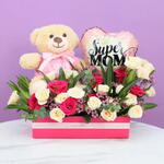 Мишка «Люблю тебя, мама» 25 см, 1 воздушный шар «Супер мама» 10 дюймов, 7 темно-розовых роз, 4 веточки персиковых маленьких роз, 3 веточки фиолетовых восковых цветов, листья - 3 веточки эвкалипта и 2 веточки ямайской хризантемы. Подготовлено в розовом акриловом подносе, перевязано розовой лентой-бантом.