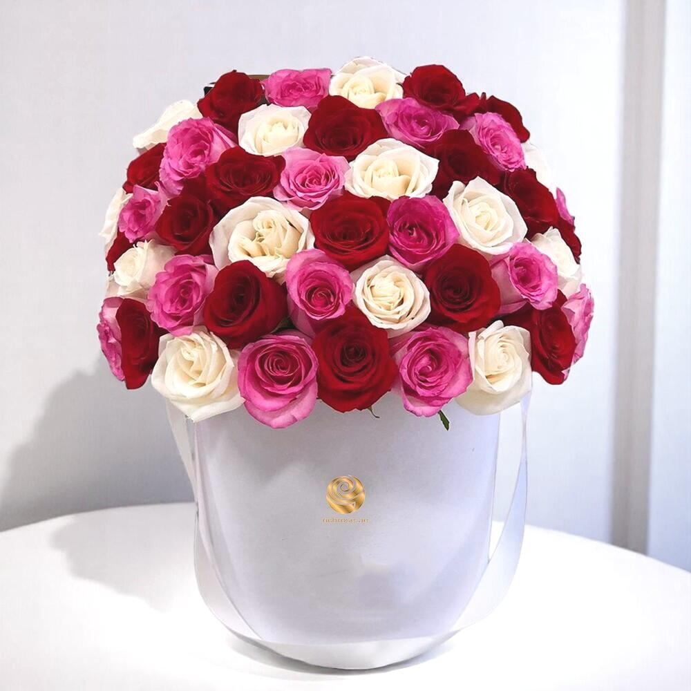 Восхитительное сочетание страсти, чистоты и очарования — этот потрясающий букет в безупречной белой коробке‑шляпке представляет трио красных, белых и розовых роз, создавая гармоничную и романтичную композицию. Идеальный подарок, чтобы выразить любовь, восхищение или радостное торжество. Чтобы ваши розы дольше сохраняли свежесть, ежедневно добавляйте немного воды в флористическую пену внутри коробки и держите букет в прохладном, затенённом месте, вдали от тепла и прямых солнечных лучей.