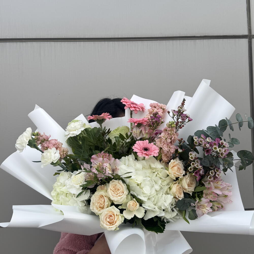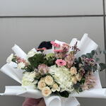 Wax flowers - 3 шт. Spray rose - 3 шт. carnation white - 3 шт. eucalyptus leaves - 3 шт. hydrangea who - 2 шт. розоватая маттиола - 3 шт. альстромерия удивительно сладкая - 2 шт.