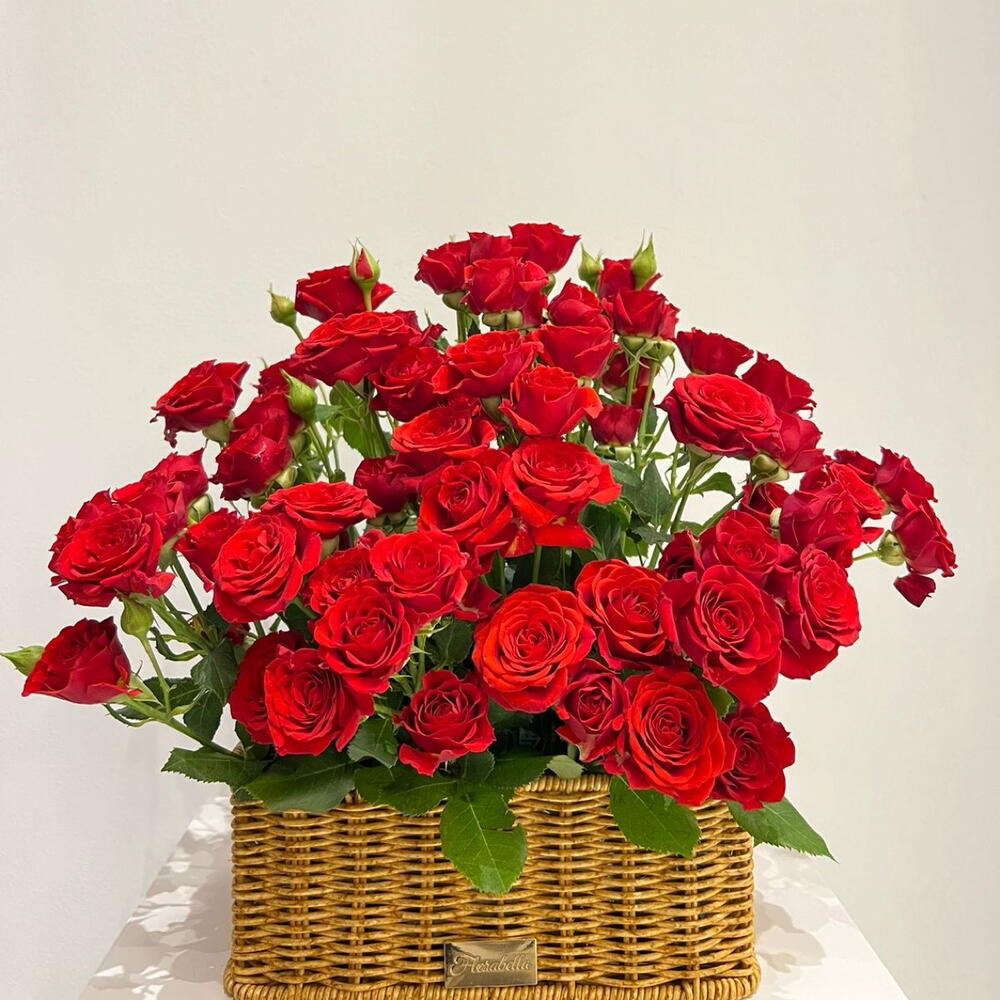 красная кустовая роза - 12 шт. прямоугольная корзина - 1 шт.