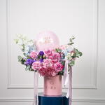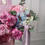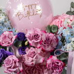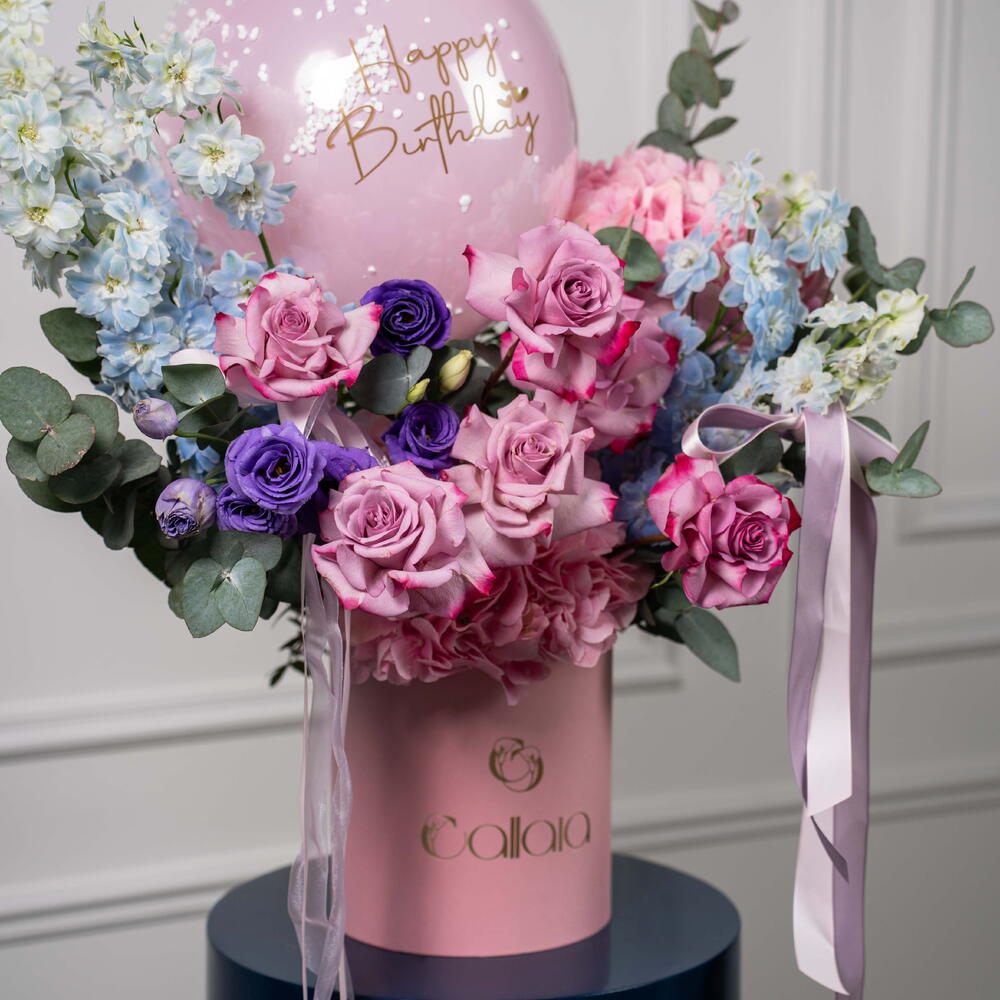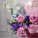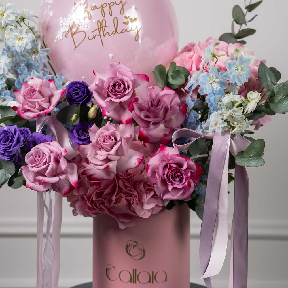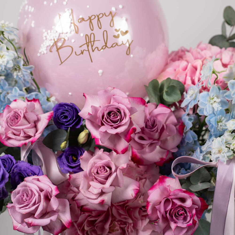 Eucalyptus - 2 шт. rose Deep purple - 6 шт. hydrangea pink - 2 шт. воздушный шар с днём рождения - 1 шт. дельфиниум небесно-голубой - 5 шт. тёмно-фиолетовая эустома - 2 шт.
