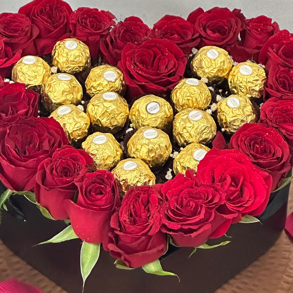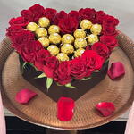 Погрузитесь в идеальную симфонию романтики с нашим ансамблем Sweetheart Symphony. Эта очаровательная композиция состоит из 25 бархатистых красных роз, элегантно сочетающихся с 16 роскошными шоколадными конфетами Ferrero, которые красиво упакованы в коробку в форме сердца с изысканной начинкой.