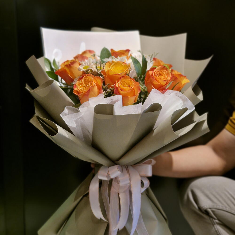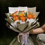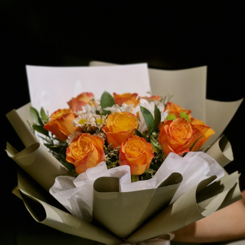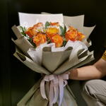 santini - 1 шт. листья рускуса - 5 шт. астремелия - 2 шт. лимониум белый - 1 шт. оранжевые розы - 10 шт.