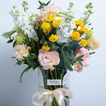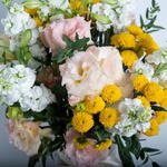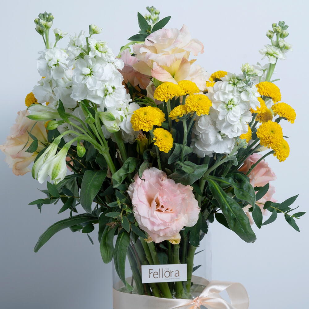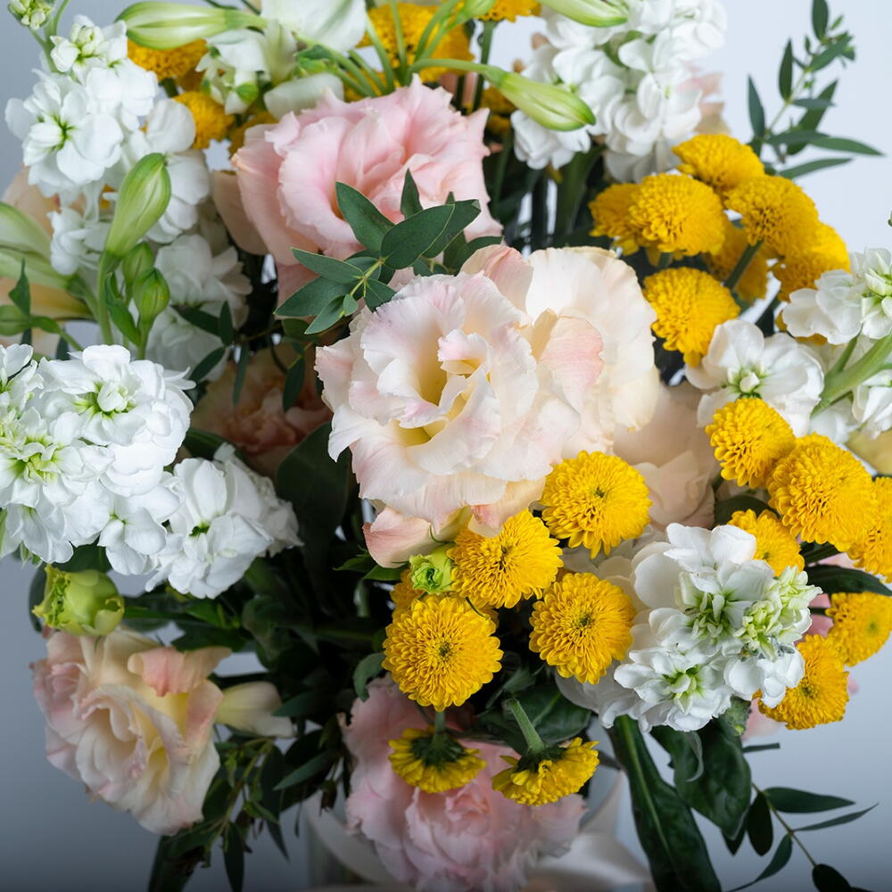 Ribbon - 1 шт. Eustoma - 3 шт. matthiola - 5 шт. хризантема желтая - 5 шт. цилиндрическая ваза - 1 шт. листья эвкалипта - 2 шт.