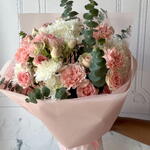 blad eucalyptus - 3 шт. wrapping m - 1 шт. rose spray dinara - 3 шт. chrysanthemum spray pinacolada - 4 шт. carnation jodie - 5 шт.