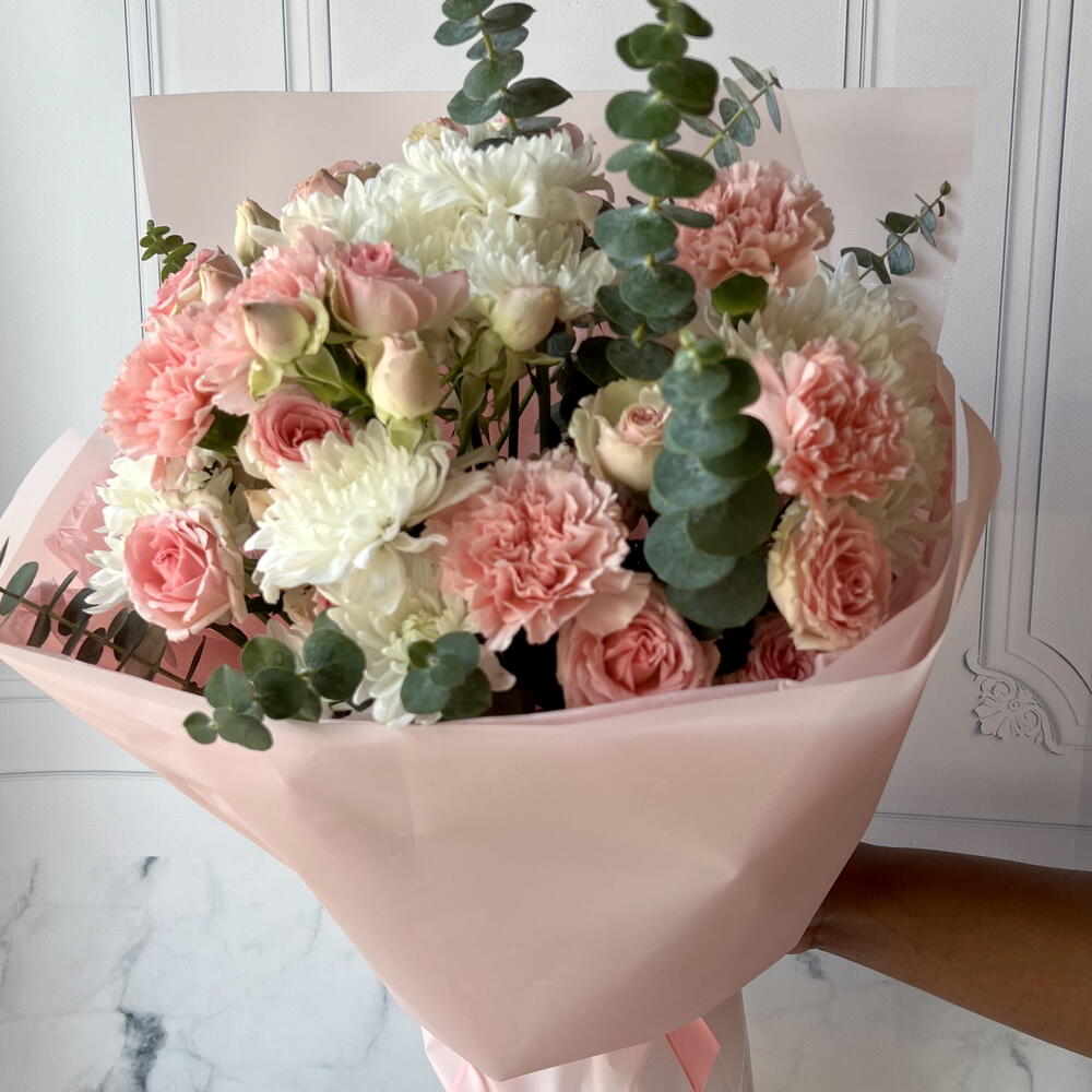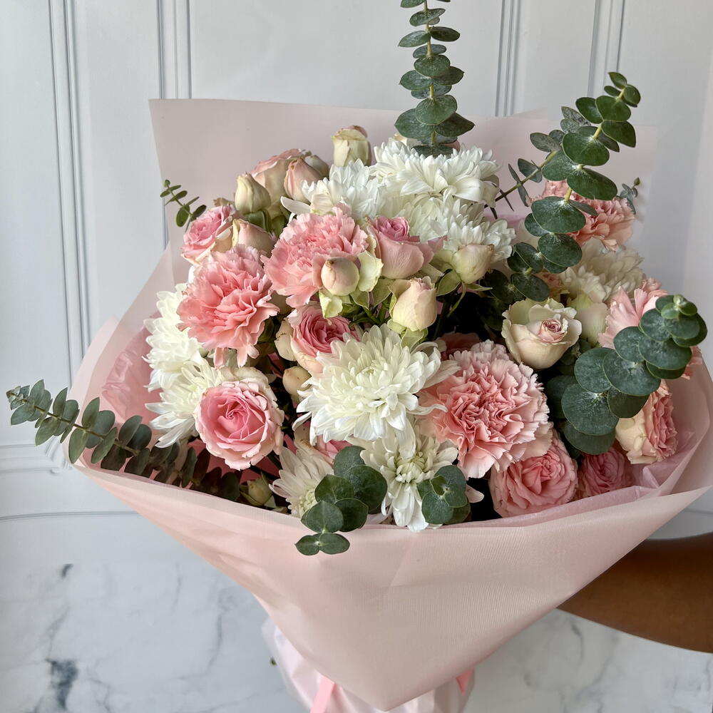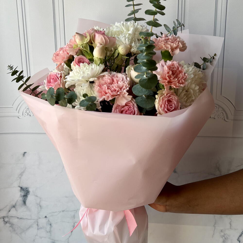 blad eucalyptus - 3 шт. wrapping m - 1 шт. rose spray dinara - 3 шт. chrysanthemum spray pinacolada - 4 шт. carnation jodie - 5 шт.