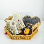 Эта роскошная корзина ручной работы наполнена восхитительным набором изысканных сладостей, что делает её идеальным подарком на праздники или особые случаи. Внутри вы найдёте хрустящее печенье, жареные кешью и банку фисташек – всё это наполнено вкусом и хрустом. Коробка фиников в форме сердца и коробка белого шоколада Velan добавят лёгкую сладость, а бутылочка натурального мёда Al Shifa дополнит набор, сделав его поистине восхитительным. Красиво оформленная и украшенная декоративными элементами, эта корзина обязательно произведёт впечатление и порадует ваших близких.