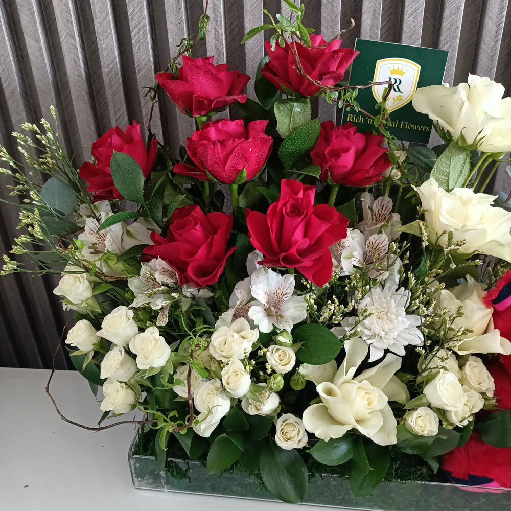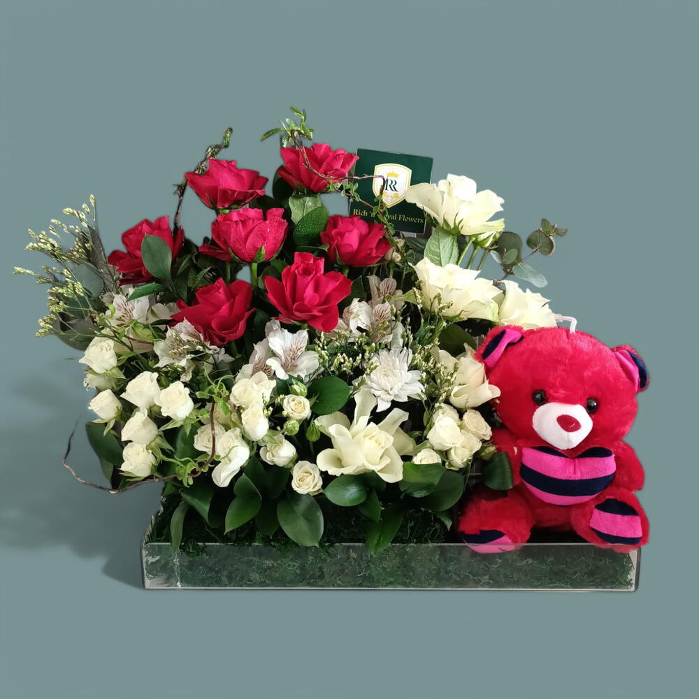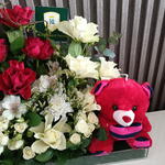 Порадуйте любимого человека нашей композицией Sweetheart Surprise Blooms. Этот притягательный дизайн сочетает вечную элегантность свежих цветов с игривым очарованием милого плюшевого мишки. Составленная из смеси ярко-красных и чисто-белых цветов, включая розы и другие сезонные цветы, эта композиция создаёт визуально впечатляющее зрелище. Мягкий плюшевый мишка в подходящем красном оттенке придаёт нотку сладости и делает этот подарок по-настоящему незабываемым. Идеально подходит для дней рождения, годовщин или просто чтобы показать свою заботу, эта композиция наверняка принесёт радость и тепло по любому поводу.